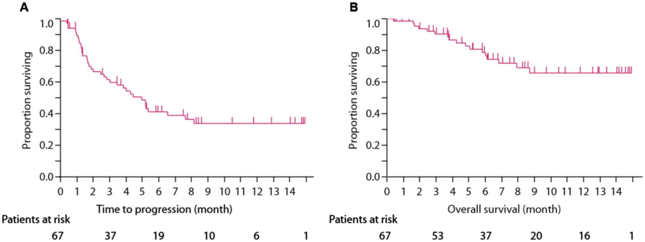 Of the 67 patients, 1 achieved a CR, 14 achieved a PR, 23 achieved stable disease status, and 25 developed progressive disease (PD) according to the RECIST criteria. A total of 4 patients were not evaluated for response due to early death or loss to follow-up. The objective response rate was 22.4% (Table II).