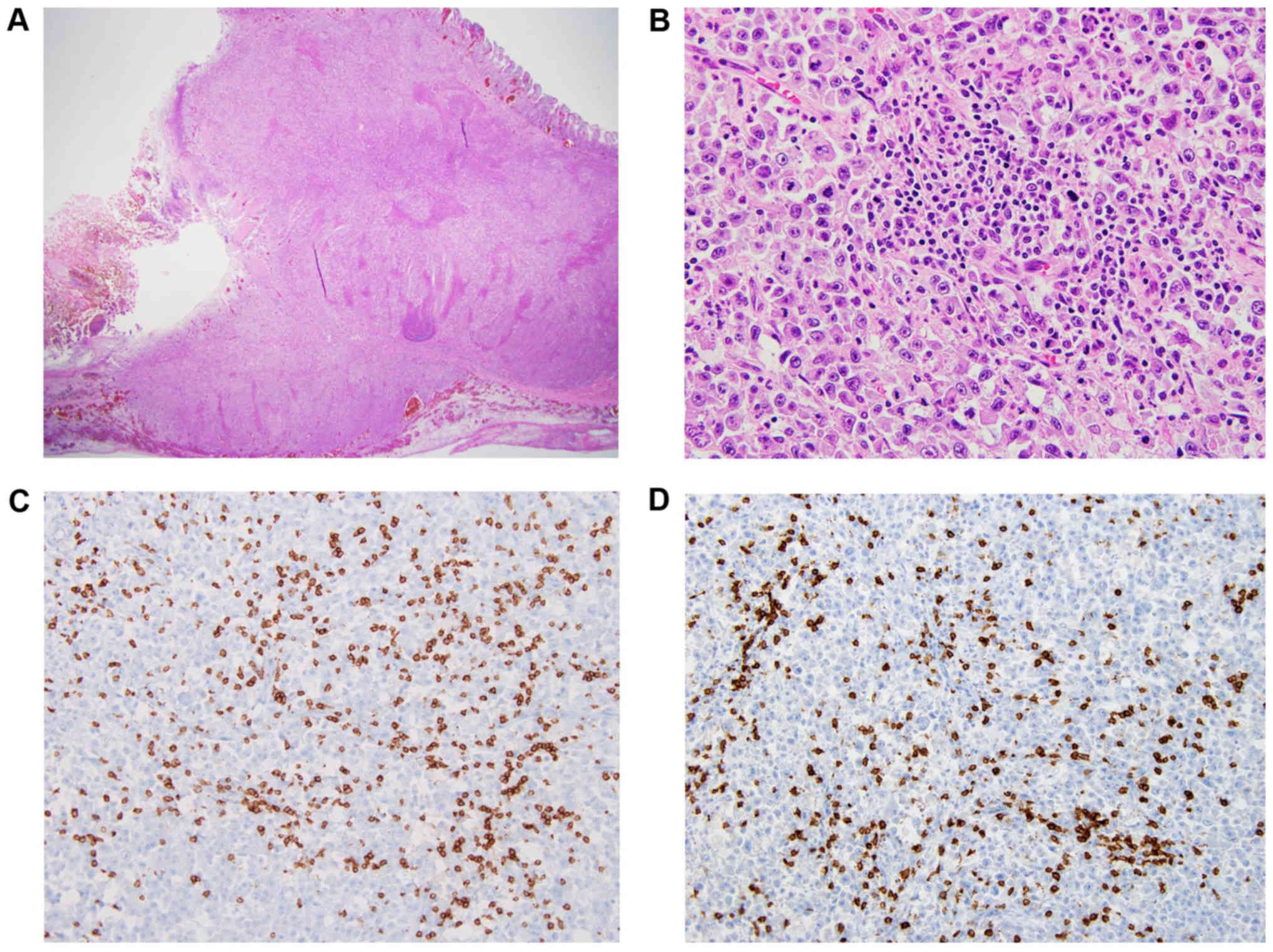 A 54-year-old man presented with acute periumbilical pain in February 2018. He had been diagnosed with metastatic NSCLC with adrenal metastasis in August 2017 at Chungbuk National University Hospital. The patient had received second-line therapy with pembrolizumab (200 mg every 3 weeks) since October 2017 after failing first-line therapy with pemetrexed and cisplatin chemotherapy. The abdominal computed tomography (CT) scan showed diffuse enhancing wall thickening at the duodenum through the proximal jejunum and signs of free air in the peritoneal cavity suggesting intestinal perforation (Fig. 1B). The patient underwent emergency laparotomy with segmental resection and anastomosis of the perforated small bowel. Microscopic examination of the resected specimen revealed diffuse transmural involvement of the tumor and massive infiltration of inflammatory cells (Fig. 2A). Immunohistochemistry (IHC) analysis indicated that the infiltrating cells primarily consisted of lymphocytes, especially CD8-positive cells (Fig. 2B and C). Histopathological findings including IHC staining for TTF-1, CK7, and CK20 for tumor cells were the same as those of the primary lung mass (data not shown). Formalin-fixed, paraffin embedded (FFPE) tissue were cut using a microtome (RM 2245; Leica Biosystems, Nussloch, Germany) and stained with hematoxylin and eosin (H&E). IHC staining methods were used according to the manufacturer's protocols; LCA (X16/99, 1:400; Novocastra), CD8 (1A5, 1:50; Cell Marque), TTF-1 (SPT24, 1:250; Cell Marque), CK7 (OV-TL 12/3-0, 1:100; Cell Marque), and CK20 (KS20.8, 1:100; Novocastra) using Benchmark XT autostainer (Ventana). The slides were counterstained with Harris haematoxylin. Retrospective review of the baseline CT scan revealed a suspicious focal wall thickening in the proximal jejunum that was missed at baseline (Fig. 1A). The primary lung tumor and a metastatic adrenal mass achieved partial response (PR) after two cycles of treatment and remained in PR state at the time of presentation (Fig. 1B). Tumor-related or gastrointestinal symptoms suggestive of intestinal pathology did not develop until the occurrence of the perforation. Treatment was skipped during the postoperative period, and a follow-up CT scan at 3 weeks after surgery showed spontaneous resolution of the small bowel wall thickening (Fig. 1C). The patient recovered without events, and pembrolizumab treatment was resumed 4 weeks after surgery.