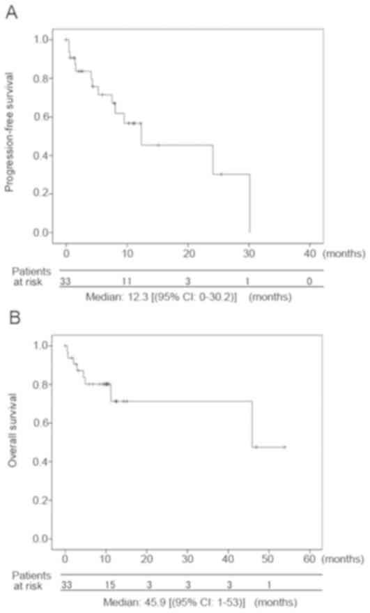 Thirteen patients were administered further treatment after nivolumab failure during the period of this investigation. Of these, all patients received VEGF receptor inhibitor, with five receiving axitinib, four receiving sunitinib, three receiving pazopanib, and one receiving sorafenib (Table IV). Only three patients (OR rate: 20.8%) showed partial response (PR), but six patients achieved stable disease (SD) even after nivolumab failure, indicating some clinical benefit.