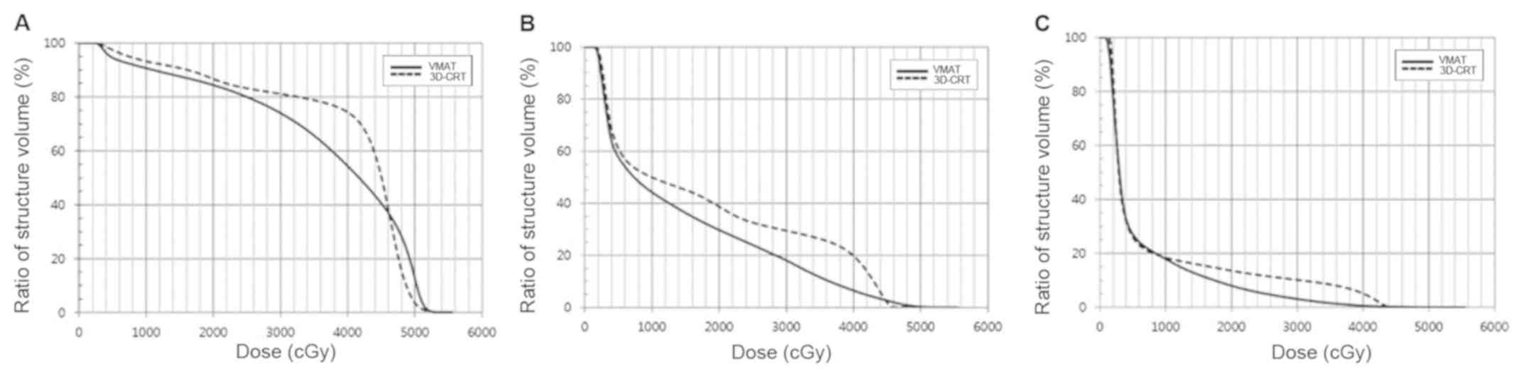 Breast cancer treatment has gradually evolved to reduce side effects without compromising treatment outcomes (1,2). Treatment-related side effects negatively affect quality of life, delay treatment, and compromise results. The typical side effects include cardiac toxicity, dermatitis, and lymphedema by multimodal treatments using surgery, adjuvant chemotherapy and radiotherapy (RT) (3-7). Among them, the incidence of breast cancer-related lymphedema (BCRL) after treatment ranges from 14 to 40% (8), caused principally by axillary lymph node dissection (ALND) and adjuvant RT, particularly irradiation of the axillary level I and II (8-10). Sentinel lymph node biopsy has thus become standard treatment for clinically node-negative patients and has become an alternative for complete ALND. RT has also evolved from application of three-dimensional conformal RT (3D-CRT) to intensity-modulated RT (IMRT) or volumetric modulated arc therapy (VMAT) to achieve better conformity with the treatment target and reduce unnecessary irradiation of normal organs (11-22). VMAT has the potential for reduced treatment time compared with IMRT and the clinical use of VMAT is increasing gradually (23). When planning VMAT, dose-volume constraints should be applied to reduce or minimize irradiation of normal tissue. If axillary constraints are imposed in VMAT plan, the axillary dose can be less than that of 3D-CRT. However, it is unclear whether incidental axillary irradiation differs in VMAT without axillary constraint, as with 3D-CRT. In the present study, we investigated the difference in incidental irradiation dose on the axilla and dosimetric characteristics between the two aforementioned plans.
