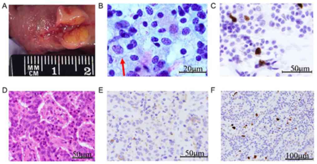 Case 2. (A) Submucosal tumor of the duodenal bulb measuring 10x10x7 mm with a light-yellow-tinged cut surface. (B) Pap staining revealed that tumor cells were arranged in loosely cohesive acinar clusters with slightly coarse cytoplasmic granules. Tumor cell chromatin exhibited a salt-and-pepper or dispersed arrangement. Nuclear atypia (arrow) was present but mitotic figures were rare (magnification, x400). (C) ICC for expression of Ki-67 antigen (magnification, x400). (D) Tumor cells form trabecular, glandular or mixed structures. The tumor capsule/pseudocapsule was relatively well preserved, with partial lymphovascular invasion. Rosette-like structures were occasionally visible and mitotic figures were rare (hematoxylin and eosin; magnification, x400). (E) IHC for expression of gastrin (magnification, x400). (F) IHC for expression of Ki-67 antigen (magnification, x400). Pap, Papanicolou; ICC, immunocytochemistry; IHC, immunohistochemistry.