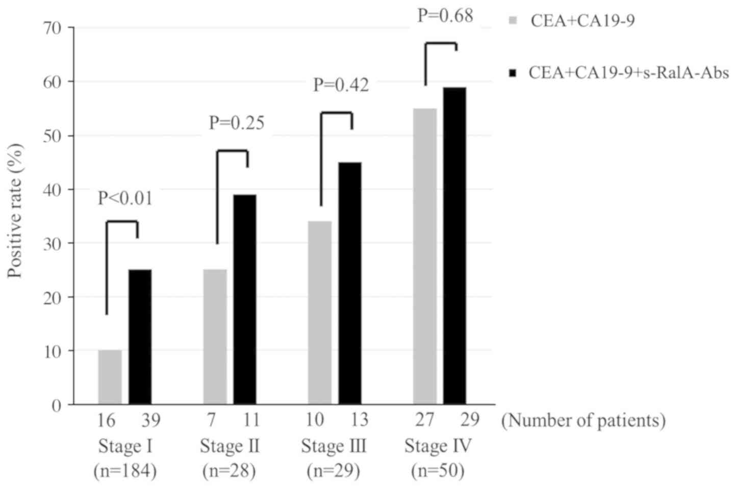 RalA construct inserted in pET28 plasmid and expressing the N-terminal His-tagged protein was provided by Dr Jian-Ying Zhang (The University of Texas, El Paso, TX). The details of this procedure have been described previously (9). Sera from patients and healthy controls were analyzed by the previously established ELISA (9). Briefly, purified recombinant proteins were placed in 96-well microtiter plates (Nunc MaxiSorp; Thermo Fisher Scientific, Inc.). RalA was diluted in phosphate-buffered saline (PBS) to a final concentration of 1.0 µg/ml and added to the plates (100 µl/well), which were then incubated overnight at 4˚C. PBS was used as a control. After two washes with PBS, proteins were blocked using 200 µl of PBS, containing 1% bovine serum albumin and 5% sucrose, at room temperature for 3 h. All human sera were diluted (1:100) in PBS containing 0.15% Tween-20, 1% casein, and 0.2 mg/ml E. coli extract. Then, 100 µl diluted sera was added to each RalA- or PBS-coated well and incubated at room temperature, while agitating at 250 rpm for 60 min. After four washes with PBS containing 0.05% Tween-20 (PBST), 100 µl horseradish peroxidase-conjugated antihuman IgG (1:5,000; Medical & Biological Laboratories Co., Ltd), diluted in 20 mM 2-[4-(2-hydroxyethyl)-1-piperazinyl] ethanesulfonic acid, 135 mM NaCl, 1% Bovine serum albumin and 0.1% hydroxiphenylacetic acid, was added to each well as a secondary antibody. The plates were incubated at room temperature, while agitating at 250 rpm for 60 min. The wells were washed four times with PBST buffer, and autoantibodies were detected by adding 100 µl of 3,3',5,5'-tetramethylbenzidine substrate. After incubation at room temperature for 30 min, the reaction was terminated by adding 0.25 N H2SO4 (100 µl/well). Absorbance was measured at 450 nm using the SUNRISE Microplate Reader (Tecan Japan Co., Ltd). RalA signals were determined by calculating the difference between the absorbance values for wells containing RalA and PBS. Serum carcinoembryonic antigen (CEA) and carbohydrate antigen 19-9 (CA19-9) markers were also evaluated as described previously (14).