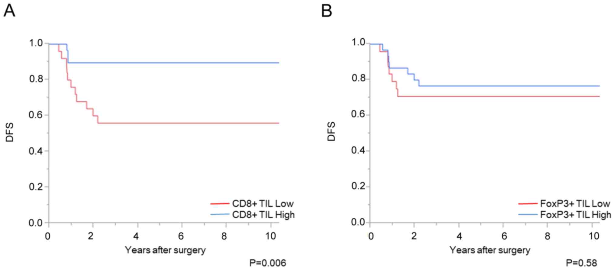 A total of 7 cases with distant metastasis were excluded from the prognostic analysis. The increased number of CD8+ TILs before CRT was significantly associated with favorable OS and DFS times (P<0.01 and P<0.01, respectively); however, there was no significant association with the number of FoxP3+ TILs (Figs. 4 and 5). Univariate analysis showed that the density of CD8+ TIL before CRT, vascular invasion and pathological T stage was associated with DFS time (P<0.01, P=0.04, and P<0.01, respectively). Using a multivariate analysis, the density of CD8+ TIL before CRT, in addition to pathological T stage, was independently associated with DFS time (Table II). With respect to OS time, univariate analysis showed that the density of CD8+ TIL before CRT and pathological T stage was associated with OS time (P<0.01 and P<0.01, respectively). In addition, multivariate analysis showed that the density of CD8+ TIL before CRT was independently associated with OS time (P=0.01), although 7 patients died.