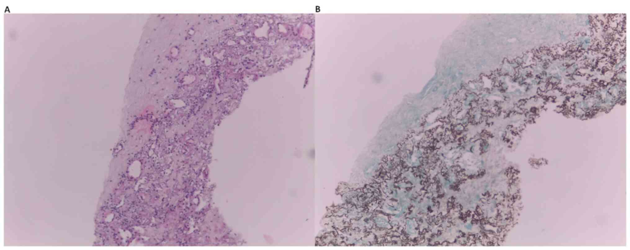 A female patient (age, 34 years) was diagnosed with nodular sclerosing Hodgkin lymphoma in 2016 (stage II-A). The patient was treated in Hospital Center of São João (Porto, Portugal) with first line chemotherapy (doxorubicin, bleomycin, vinblastine and dacarbazine) and mediastinal and right axillary radiotherapy. The patient had no other relevant comorbidities (such as auto-immune disease), no history of smoking, no known relevant occupational or environmental exposure and was not prescribed regular medication. In 2018, the patient presented with insidious onset exertional dyspnea and reported a respiratory tract infection that was treated with antibiotics (amoxicillin and clavulanic acid). Physical examination of the patient did not result in any relevant findings. Laboratory blood tests and blood gas analysis were normal. The patient's lung volumes in lung functional tests were within normal range, but the diffusing capacity for carbon monoxide (53%) and adjusted alveolar volume (54%) were decreased (6). High-resolution computed tomography (HRCT) of the chest revealed biapical subpleural opacity with interstitial thickening and slight upper lobe volume loss (Fig. 1). These features were not present in previous scans. These changes were subtle, which is also the reason why lung volumes in the respiratory function test were normal. It was hypothesized that the diffusing capacity for carbon monoxide was depressed due to sequelae from previous radiotherapy that resulted in changes in lung function that may not be seen in CT scan. Given her past history of malignancy, a percutaneous transthoracic lung biopsy was performed, which revealed pleural fibrosis and subpleural and parenchymal fibroelastosis (Fig. 2). Following evaluation and discussion among the ILD multidisciplinary team, the patient was diagnosed with PPFE. To date, the patient remains clinically and functionally stable in follow-up appointments. Hence, the patient has not yet been treated with immunosuppressive therapy.