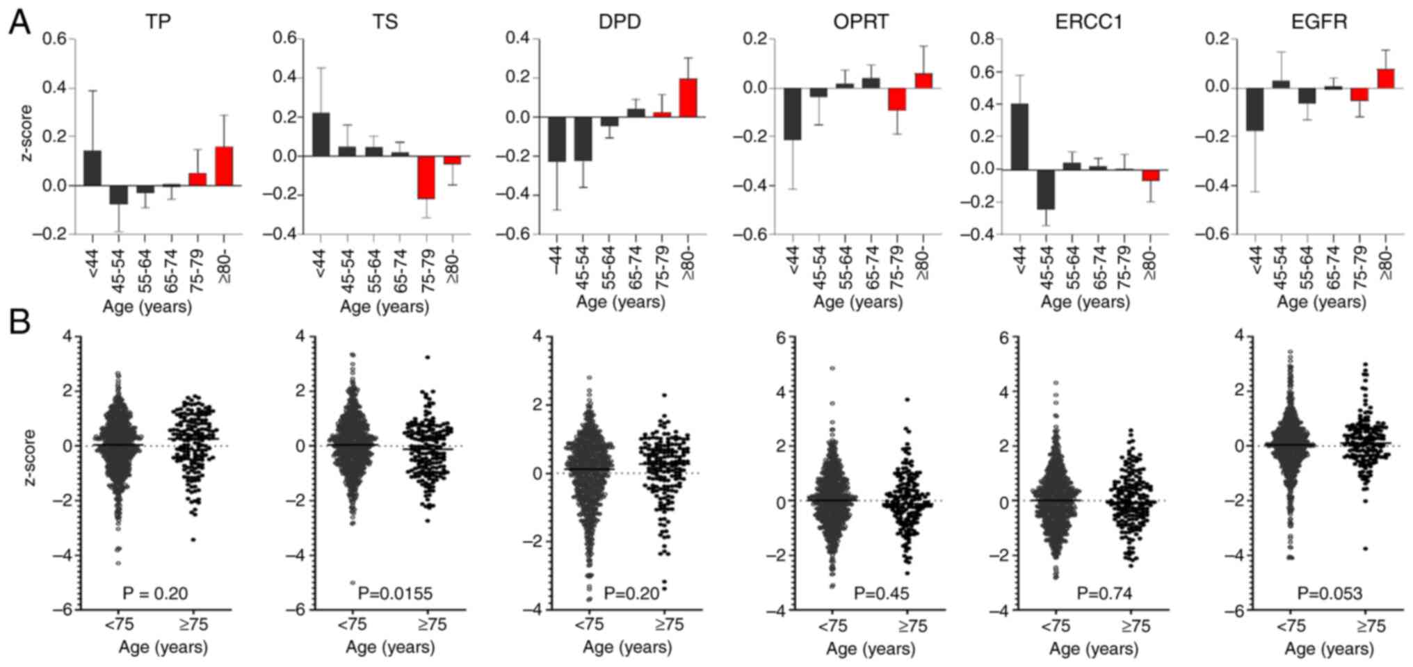 We investigated the impact of age on the expression of six genes by analyzing RNA-seq data of 955 samples (776 samples from patients younger than 75 years and 179 from patients aged ≥75 years) from the TCGA database (Tables SII and SIII). Gene expression levels were compared across age groups (Fig. 1). Using the Mann-Whitney U test, TS expression decreased significantly with age, especially in the age group ≥75 years (P=0.0155). In contrast, DPD and TP expression levels increased to a similar extent in the age groups <75 and ≥75 years.
