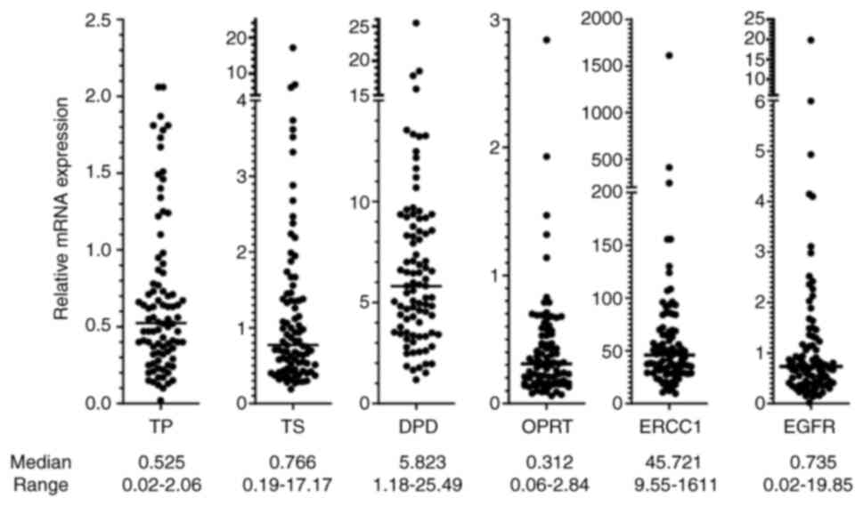 The relative mRNA expression levels of six genes are shown in Fig. 2. The median Ct value of ACTB of all 89 samples was 15.69 (range, 11.65-26.66), indicating that the mRNA quality was adequate. However, some genes were not amplified in three samples: TP and EGFR in one sample (the Ct of ACTB was 26.66) and OPRT in two samples (the Ct of ACTB was 21.72 and 19.88, respectively). There were no significant correlations between the relative mRNA expression levels of these genes (Fig. S1).