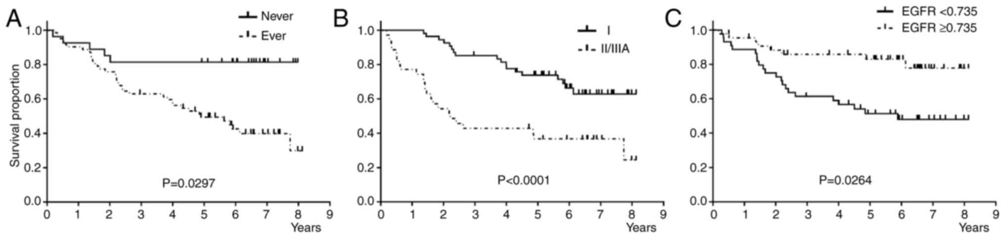 Univariate analysis showed that never smokers, patients with pStage I, and patients with EGFR upregulation showed significantly better RFS than the groups (Fig. 3, and Table IIIA). Multivariate analysis, including the factors with P-value ≤0.1, showed that pStage I was an independent favorable prognostic factor for RFS (Table 3A). Stepwise multivariate analysis showed that pStage I and never smoking status were independent favorable prognostic factors for RFS (Table SIVA).