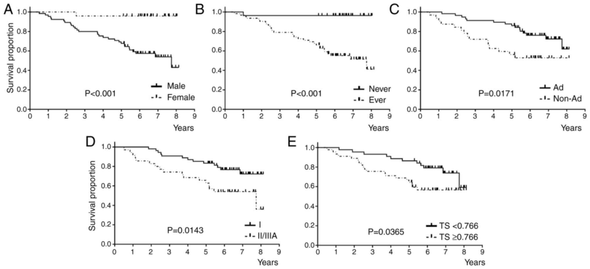 Univariate analysis revealed that female sex, never smoking status, adenocarcinoma histology, pStage I, and TS downregulation were significantly associated with better OS than the others (Fig. 4 and Table IIIB). Multivariate analysis, including the factors with P-value ≤0.1, showed that pStage I was an independent favorable prognostic factor for OS (Table IIIB). Stepwise multivariate analysis indicated that pStage I and never smoking status were independent favorable prognostic factors for OS (Table SIVB).