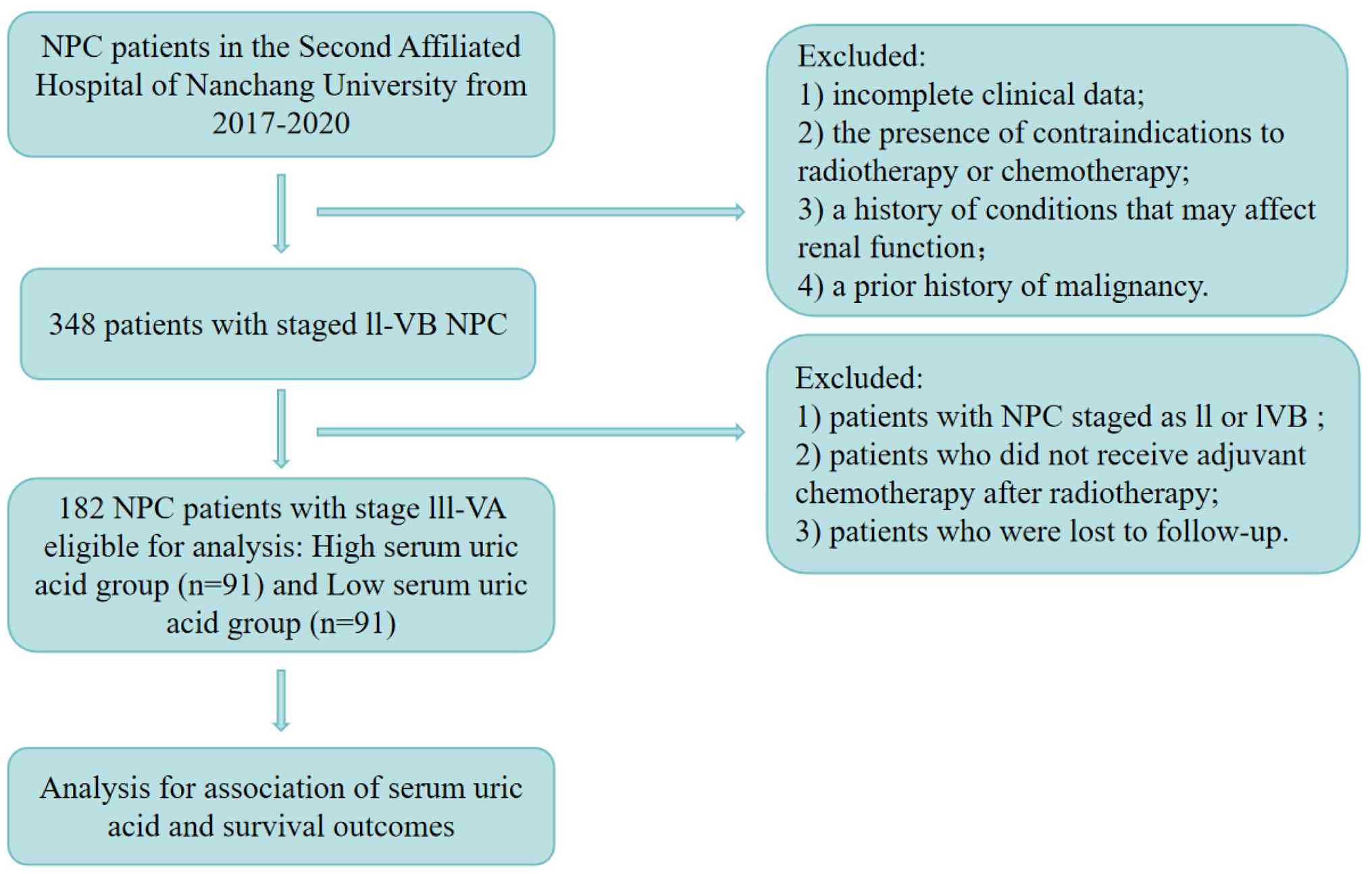 The present study included 182 patients with locally advanced NPC who were admitted in January 2020, confirmed by pathological diagnosis and without distant metastasis at presentation. The cohort consisted of 119 male (65.4%) and 63 female (34.6%) patients. The median age was 50 years (range: 18-78 years). Inclusion criteria (all required): i) Patients initially diagnosed with NPC by the Department of Pathology of The Second Affiliated Hospital of Nanchang University (Nanchang, China); ii) exclusion of hyperuricemia or gout before treatment; iii) patients staged from III to IVb according to the 7th edition of AJCC staging criteria in 2010; iv) patients who have not undergone antitumor treatments such as radiotherapy and chemotherapy in other hospitals; and v) availability of complete clinical data. Exclusion criteria (any of the following): i) Patients with incomplete clinical data; ii) patients with contraindications to radiotherapy and chemotherapy; iii) patients with a history of diabetes, hypertension, rheumatic autoimmune diseases, or other conditions that may affect kidney function; iv) patients with a history of hyperuricemia, gout, renal insufficiency, or other conditions affecting SUA levels; v) patients with a history of malignant tumors; vi) patients concurrently suffering from malignant tumors in other organs; and vii) patients who did not complete intensity-modulated radiation therapy within the specified time. Pretreatment evaluation included blood biochemistry, fiberoptic nasopharyngoscopy, nasopharyngeal and neck magnetic resonance imaging (MRI), chest computed tomography (CT), abdominal ultrasonography and whole-body bone scan. All SUA measurements were performed in the same central laboratory of the Second Affiliated Hospital of Nanchang University following standardized clinical procedures. The flowchart for patient selection is shown in Fig. 1.