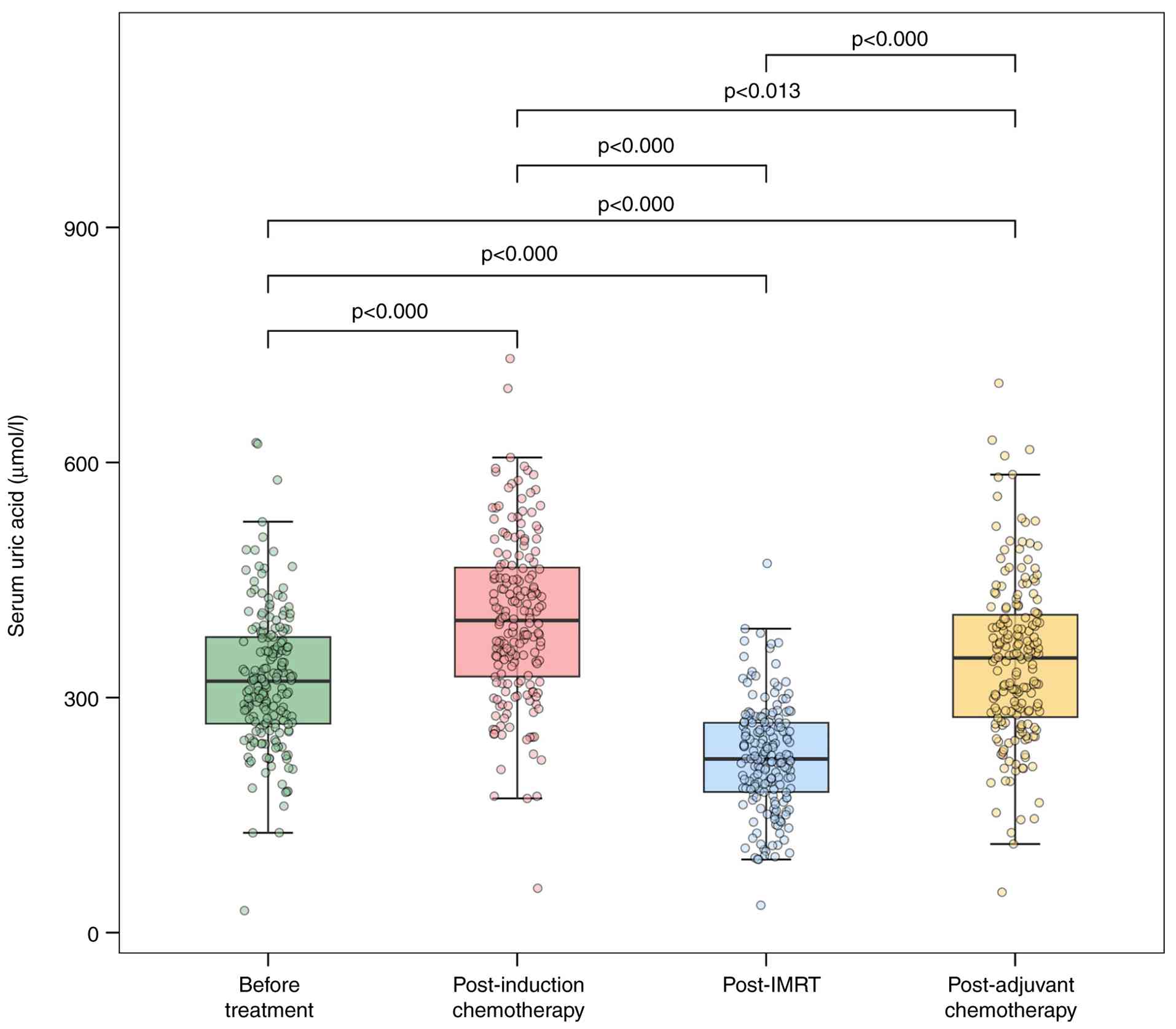 Post-hoc multiple comparisons using the Bonferroni adjustment revealed significantly lower SUA levels post-radiotherapy compared with pretreatment [t(543)=-19.10; P<0.001; Cohen s d=-1.47], post-induction chemotherapy [t(543)=-29.15; P<0.001; Cohen s d=-2.59] and post-adjuvant chemotherapy [t(543)=-18.50; P<0.001; Cohen s d=-1.80]. Repeated-measures ANOVA confirmed that SUA levels were lowest post-radiotherapy compared with all other time points (Fig. 3).