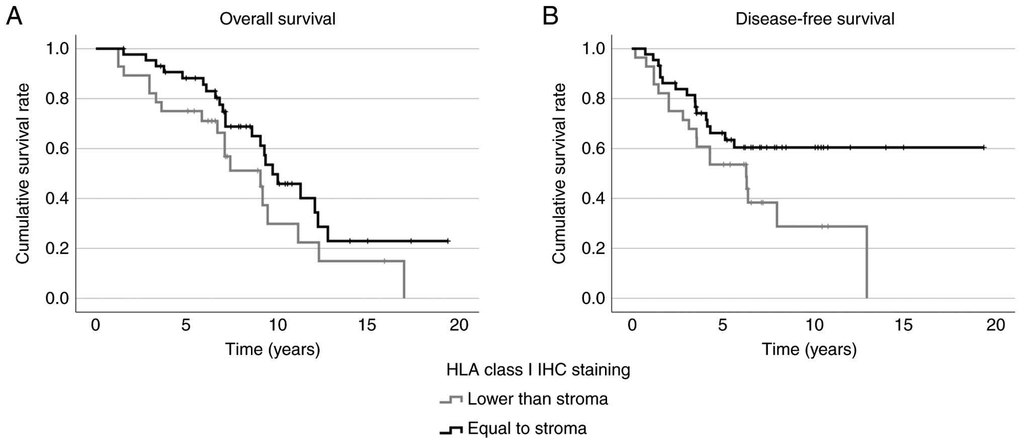 The χ2 or Fisher's exact test was used for categorical data, while comparison of mean values was done with paired or unpaired Student's t-tests, when appropriate. Clinical outcome data were obtained from medical records. Overall survival (OS) was calculated in years from the date of diagnosis until the date of death or the date of OS assessment (11-12 May 2022). Disease-free survival (DFS) was calculated in years from the date of diagnosis until the first documented recurrence or until the date of DFS assessment (11-12 May 2022). Patients without a disease-free period were censored at day 0, and patients who died without a documented recurrence were censored at their date of death. For HLA class I data, the Kaplan-Meier estimator was used to visualize OS and DFS, and the log-rank test was applied to assess differences in survival. P<0.05 was considered to indicated a statistically significant difference. All analyses were performed using IBM SPSS Statistics for Mac, version 31 (IBM Corp.).