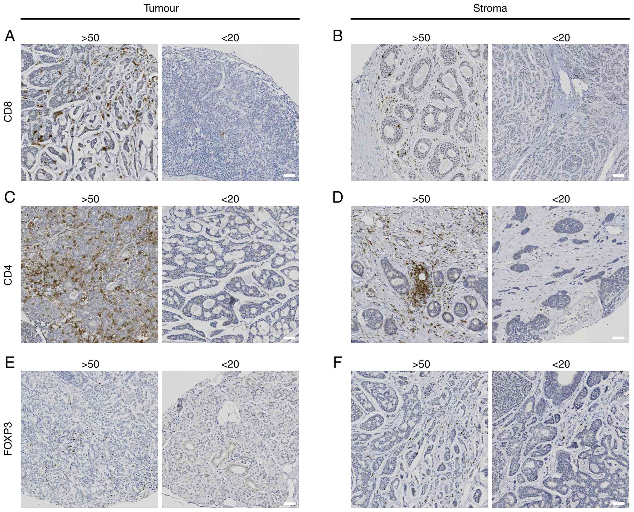 CD8, CD4 and FOXP3 staining in the tumour and/or stroma varied from 0 to >300 positive cells per mm2. Examples of CD8, CD4 and FOXP3 staining are illustrated in Fig. 3.