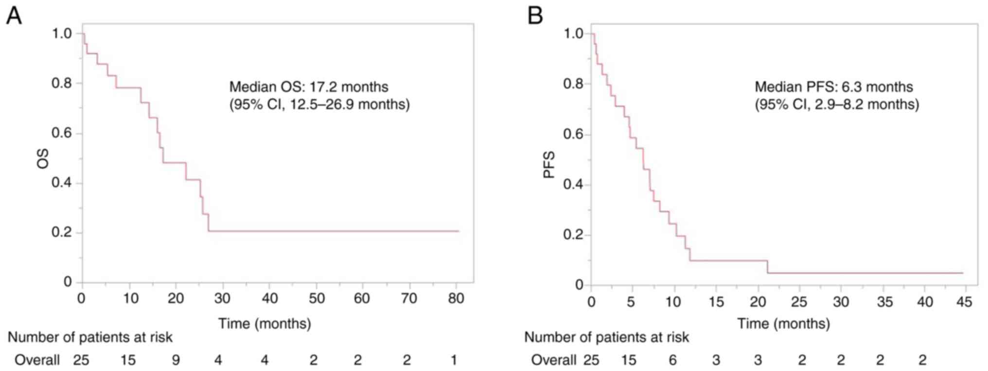 Univariate analyses were conducted using the Cox regression model to identify risk factors associated with OS or PFS. Multivariate analyses were used to assess the impact of independent variables on survival. For variable selection, all factors were evaluated using P<0.10 in univariate analyses. OS and PFS were calculated using the Kaplan-Meier method and assessed using the log-rank test. Data analysis was carried out using JMP Pro version 17.0 (SAS Institute, Inc.). P<0.05 was considered to indicate a statistically significant difference.