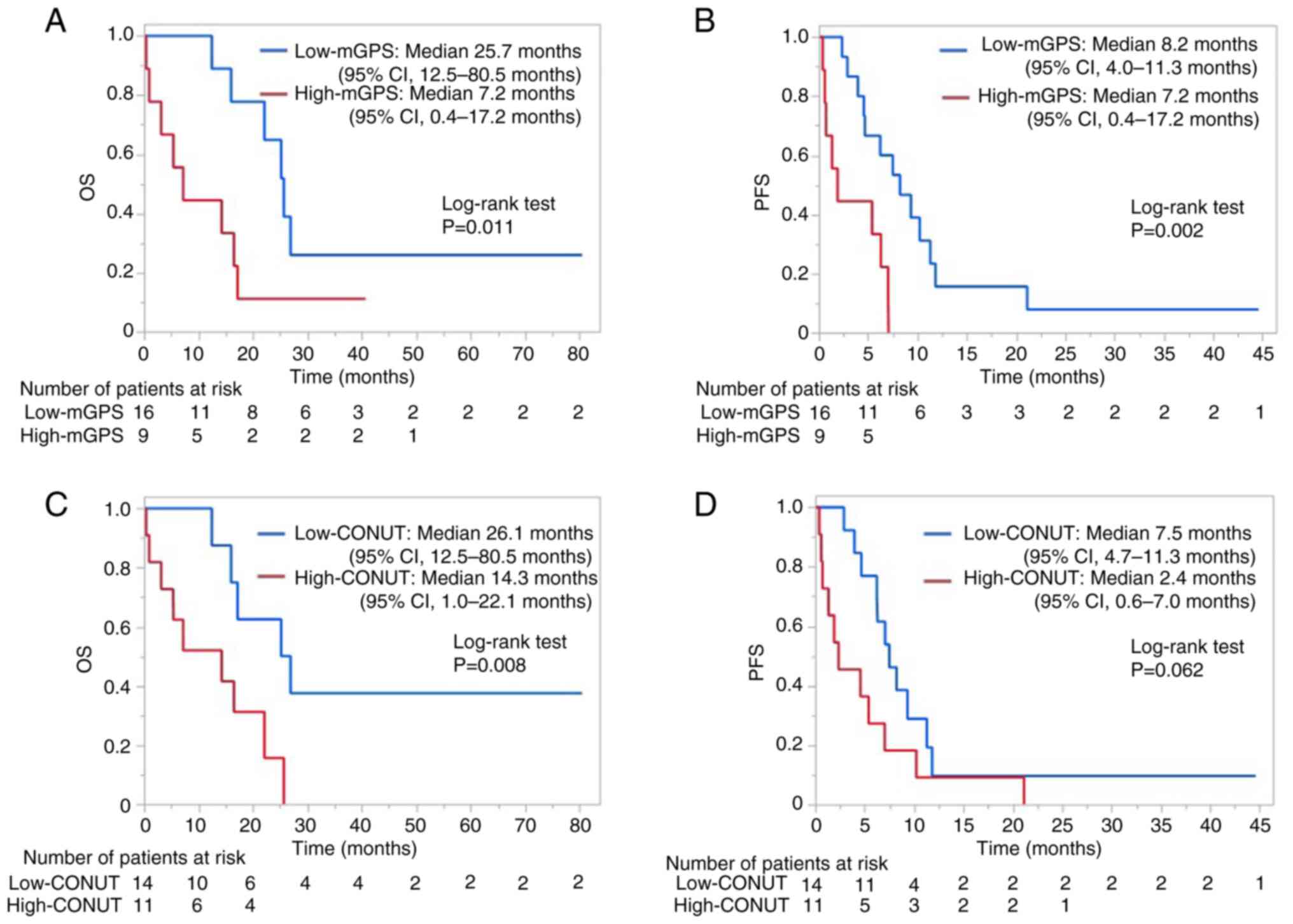 Univariate and multivariate analyses suggested that low mGPS and low CONUT nutritional scores may contribute to an improved prognosis. Therefore, these factors were further investigated using survival curves. The Kaplan-Meier survival curves for OS and PFS stratified by mGPS and CONUT scores are shown in Fig. 2. The median OS was significantly longer in the low-mGPS group [25.7 months (95% CI, 12.5-80.5 months)] compared with the high-mGPS group [7.2 months (95% CI, 0.4-17.2 months)] (Fig. 2A). In addition, the median PFS was significantly longer in the low-mGPS group [8.2 months (95% CI, 4.0-11.3 months)] compared with the high-mGPS group [1.9 months (95% CI, 0.4-7.0 months)] (Fig. 2B).