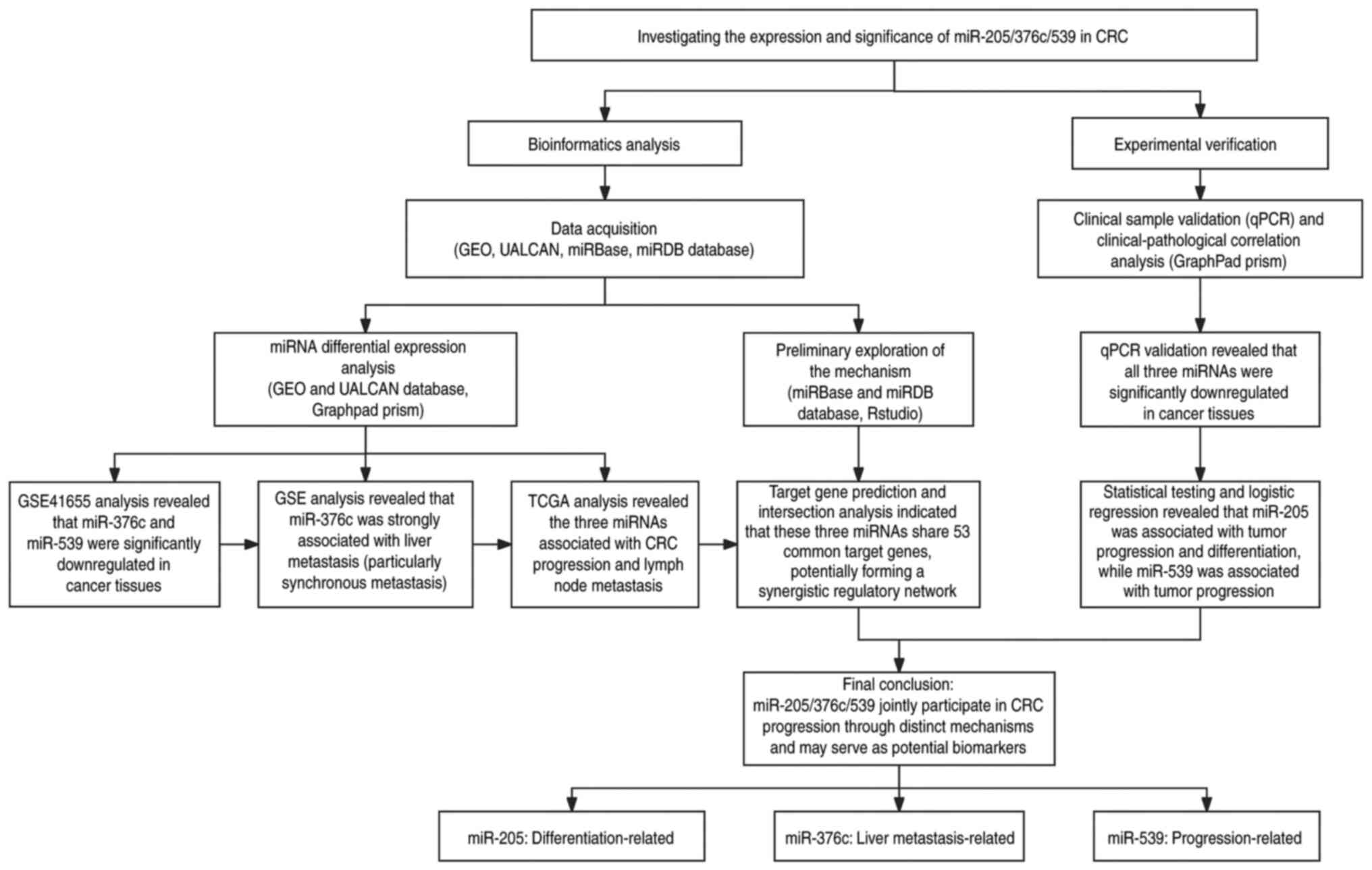 MiRNA microarray data of solitary CRC were obtained from the Gene Expression Omnibus (GEO) database (https://www.ncbi.nlm.nih.gov/geo/) and the University of Alabama at Birmingham CANcer data analysis Portal (UALCAN) (https://ualcan.path.uab.edu/analysis-mir.html). The GSE41655 and GSE81581 datasets were used to investigate the expression of miR-205, miR-376c, and miR-539 in CRC (12,13). miRNA sequences and predicted target gene data were primarily sourced from miRDB (https://mirdb.org/) and miRBase (https://www.mirbase.org/).