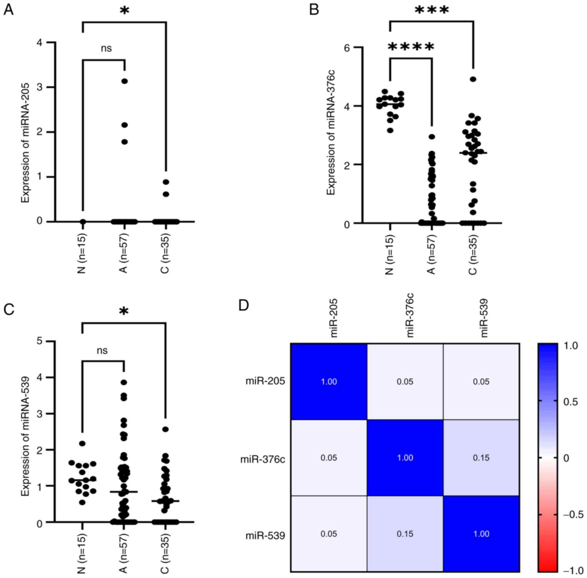Relevant miRNA expression data were downloaded from the GEO database based on the GSEE41655 and GSE81581 datasets (13). The downloaded raw data were preliminarily processed and standardized in RStudio 2025.5.1.513 using the Bioconductor 3.18 package (14). Statistical analysis was performed using GraphPad Prism 10.6.1 software (Dotmatics). After performing a normality test on the expressed data, the Kruskal-Wallis test was selected for nonparametric analysis. Subsequently, Dunn's post hoc pairwise multiple comparisons were conducted for groups showing significant differences to obtain the results. The significance level was then set and Bonferroni correction was applied for multiple comparison adjustments. Concurrently, Spearman's ρ correlation analysis was employed to perform pairwise correlation analyses on the acquired data, generating correlation heatmaps. Bonferroni correction was applied to each correlation test.