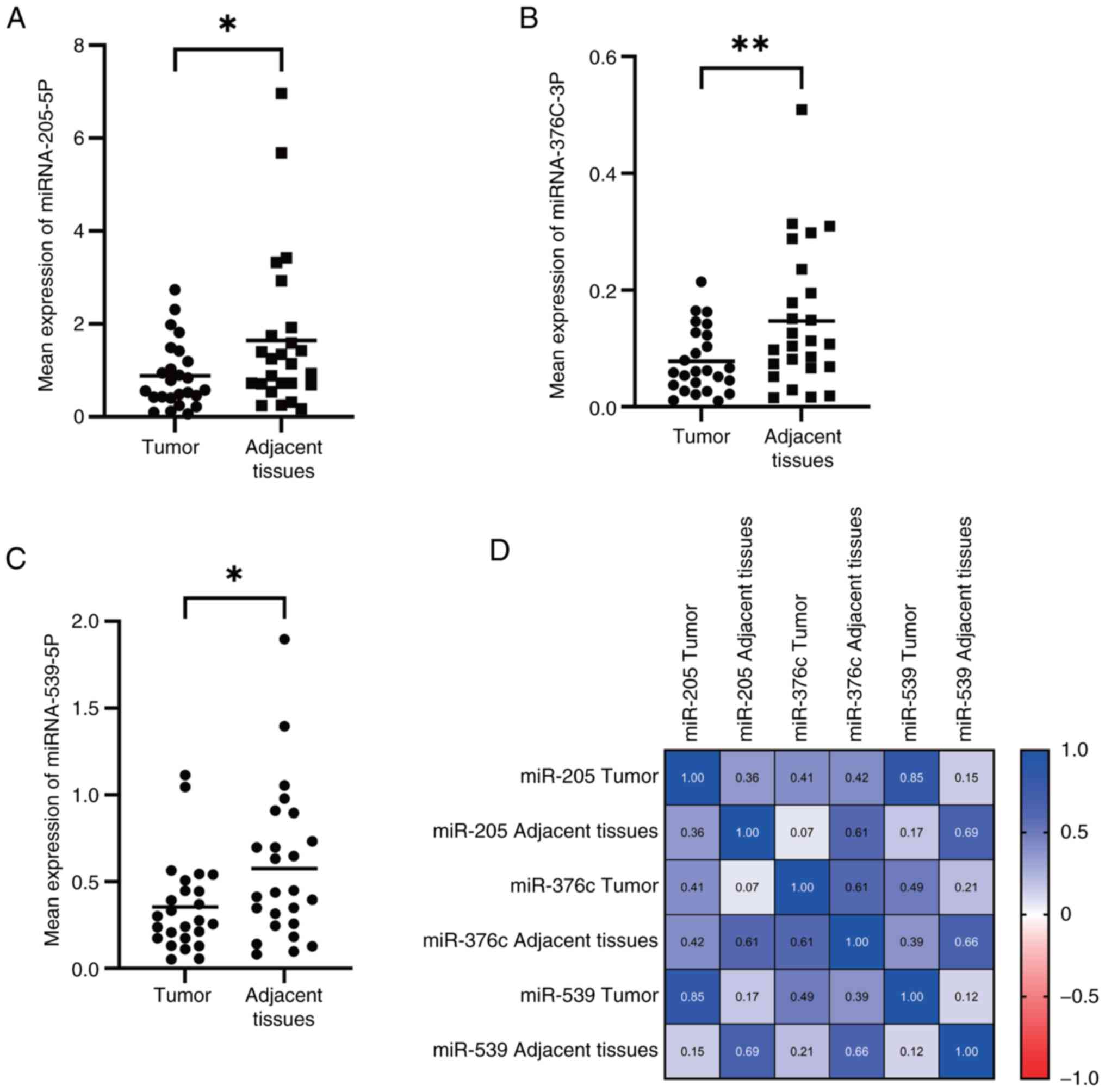 miRNAs also play important roles in tumor biology, including tumor evolution, invasion, metastasis, and angiogenesis (24). In the present study, the differences in the expression levels of miR-205, miR-376c, and miR-539 between CRC and adjacent tissues in 25 CRC patients were analyzed and found significant differences in the expression levels of the three miRNAs in cancer and matched normal tissues.