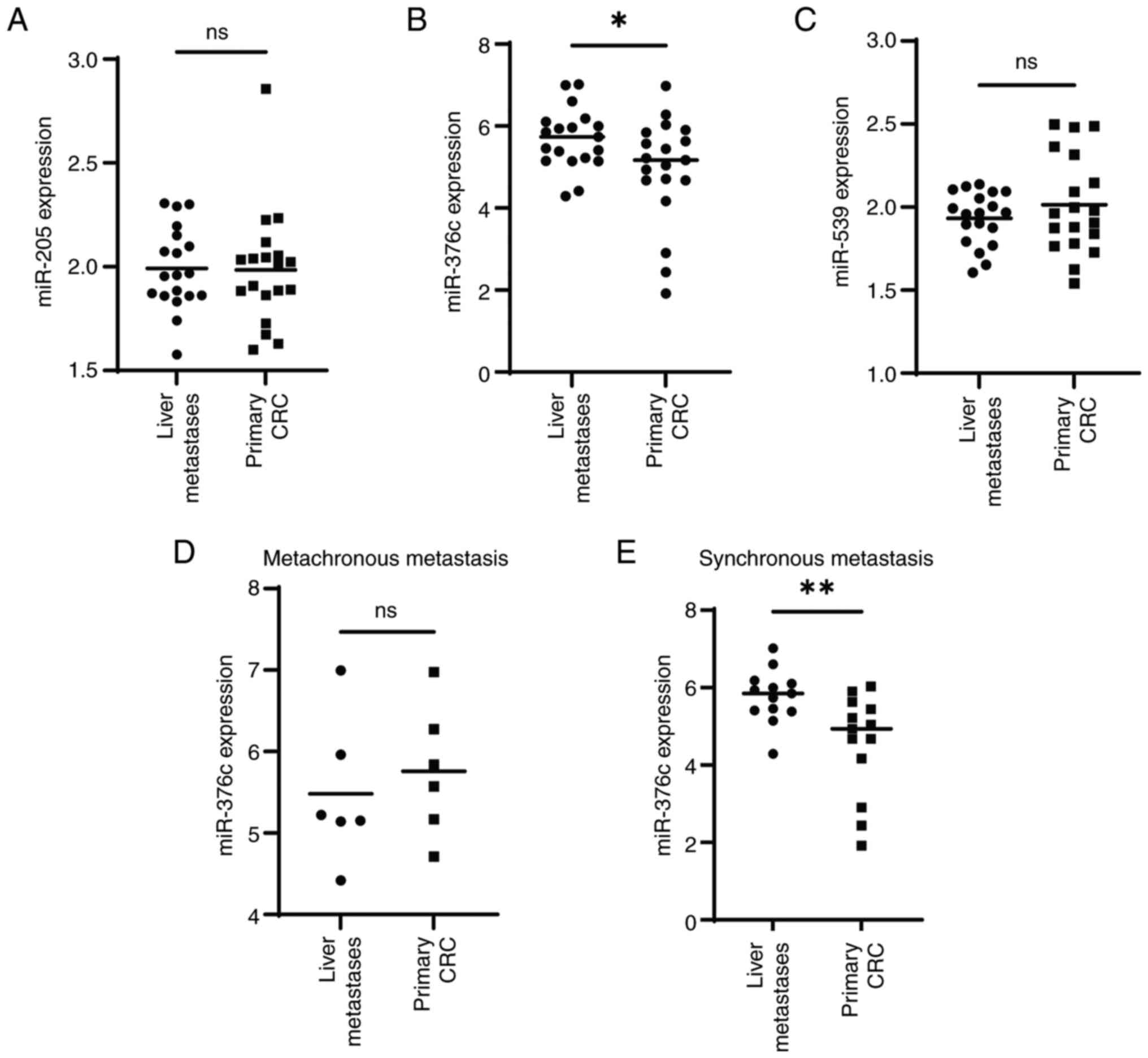 In order to further explore the role of the aforementioned three microRNAs in the development of CRC, the GSE81581 dataset was used. Compared with primary CRC tissues, miRNA-376c expression was increased in CRC liver metastases (P<0.05; Fig. 4B), especially in the case of synchronous liver metastasis (Fig. 4E), while the expression levels of miR-205 (P>0.05; Fig. 4A) and miR-539 (P>0.05; Fig. 4C) were not significantly altered in CRC liver metastases. In addition, miR-376c expression exhibited no significant changes in CRC metachronous liver metastasis (P>0.05; Fig. 4C).