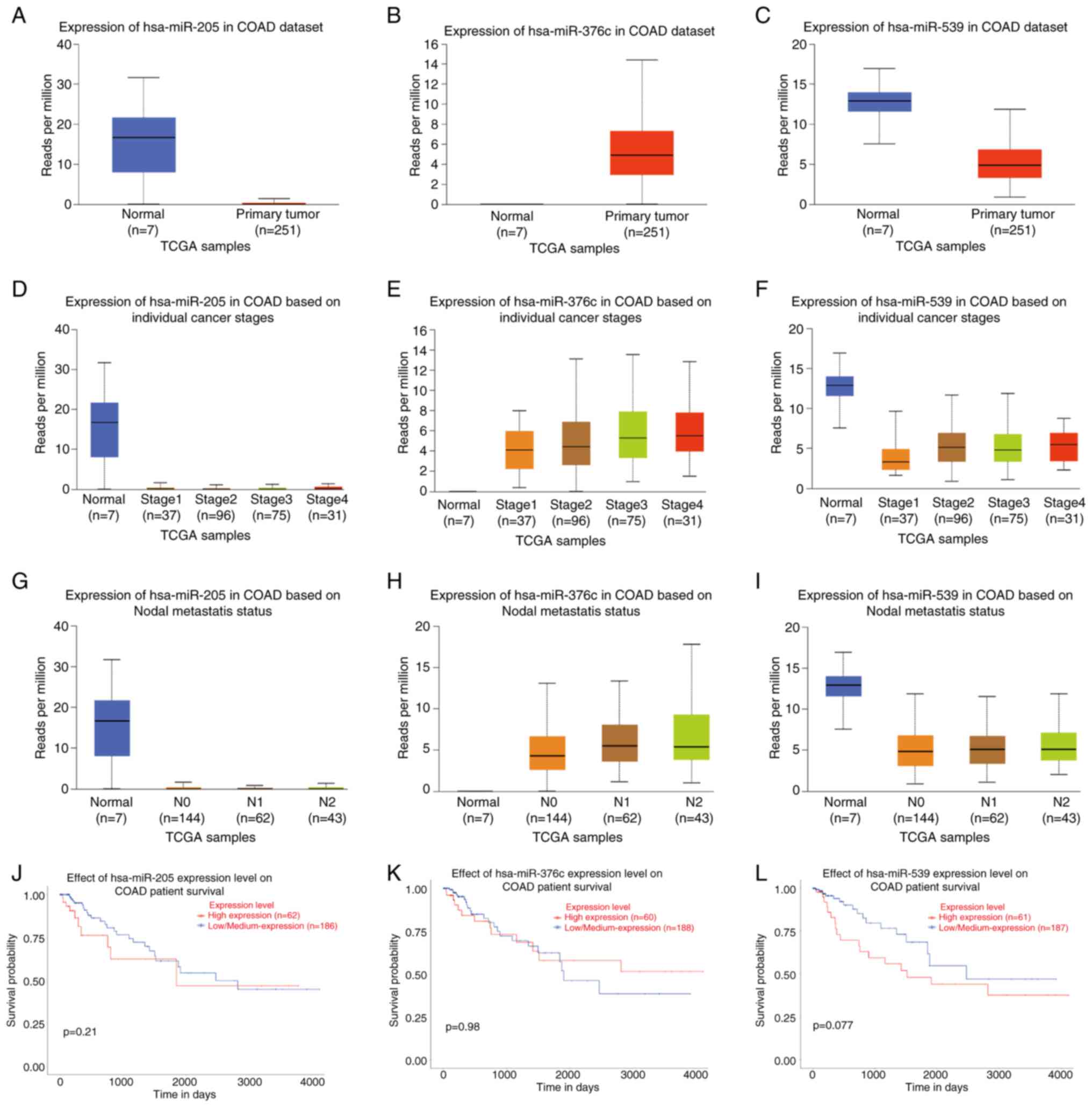 CRC is characterized by frequent metastasis, high invasiveness, and rapid development and high mortality. The expression of miR-205, miR-376c, and miR-539 was analyzed in the TCGA database via UALCAN. As revealed Fig. 5A-C, miR-376 expression was upregulated in primary cancer, while the expression levels of miR-205 and miR-539 were relatively high in normal tissues. The expression of miR-205, miR-376c, and miR-539 was closely associated with individual cancer stage (Fig. 5D-F) and lymph node metastasis (Fig. 4G-I), but showed no direct association with late survival (P>0.05; Fig. 5J-L).