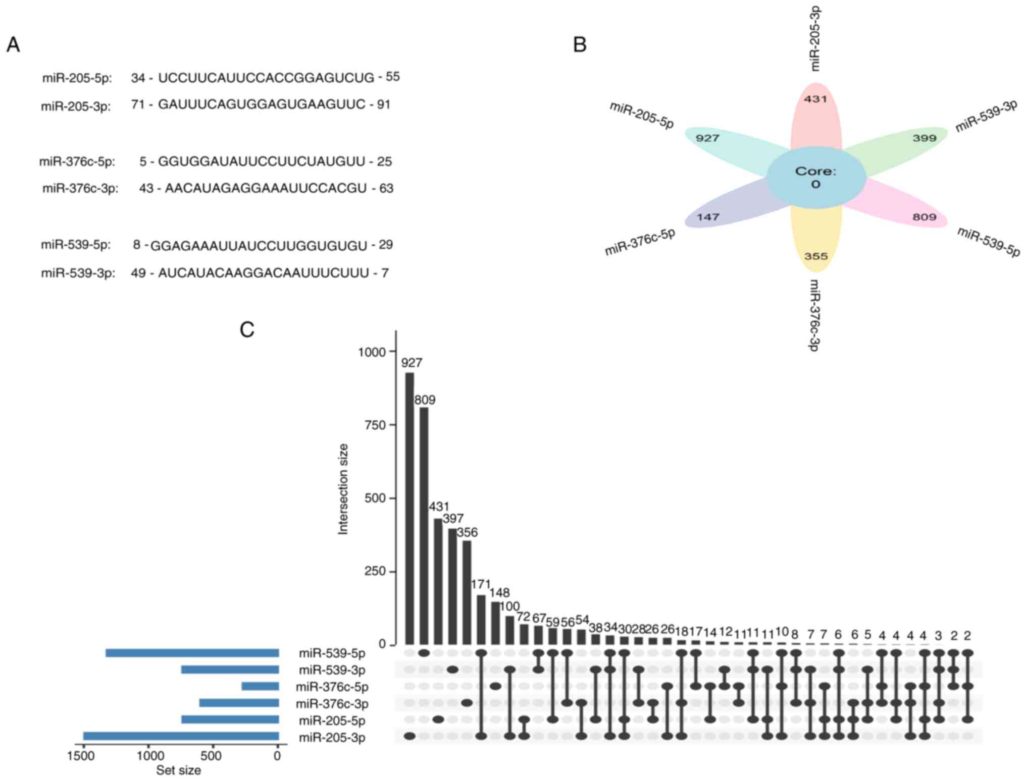 To further investigate the relationships among miR-205, miR-376c, and miR-539, the 5' and 3' mature sequences of these three miRNAs were obtained from the miRBase database. No significant common sequences identified among the mature forms of these three miRNAs (Fig. 6A). Subsequently, the predicted target genes of miR-205, miR-376c, and miR-539 were retrieved from the miRDB database and the relationships among these target genes were analyzed. Venn diagram analysis indicated that there were no common target genes among the six distinct sequences, miR-205-3p, miR-205-5p, miR-376c-3p, miR-376c-5p, miR-539-3p, and miR-539-5p (Fig. 6B). However, the UpSet plot revealed that the mature sequences of miR-205, miR-376c, and miR-539 (5p or 3p end sequences) share a total of 53 predicted target genes (Fig. 6C).