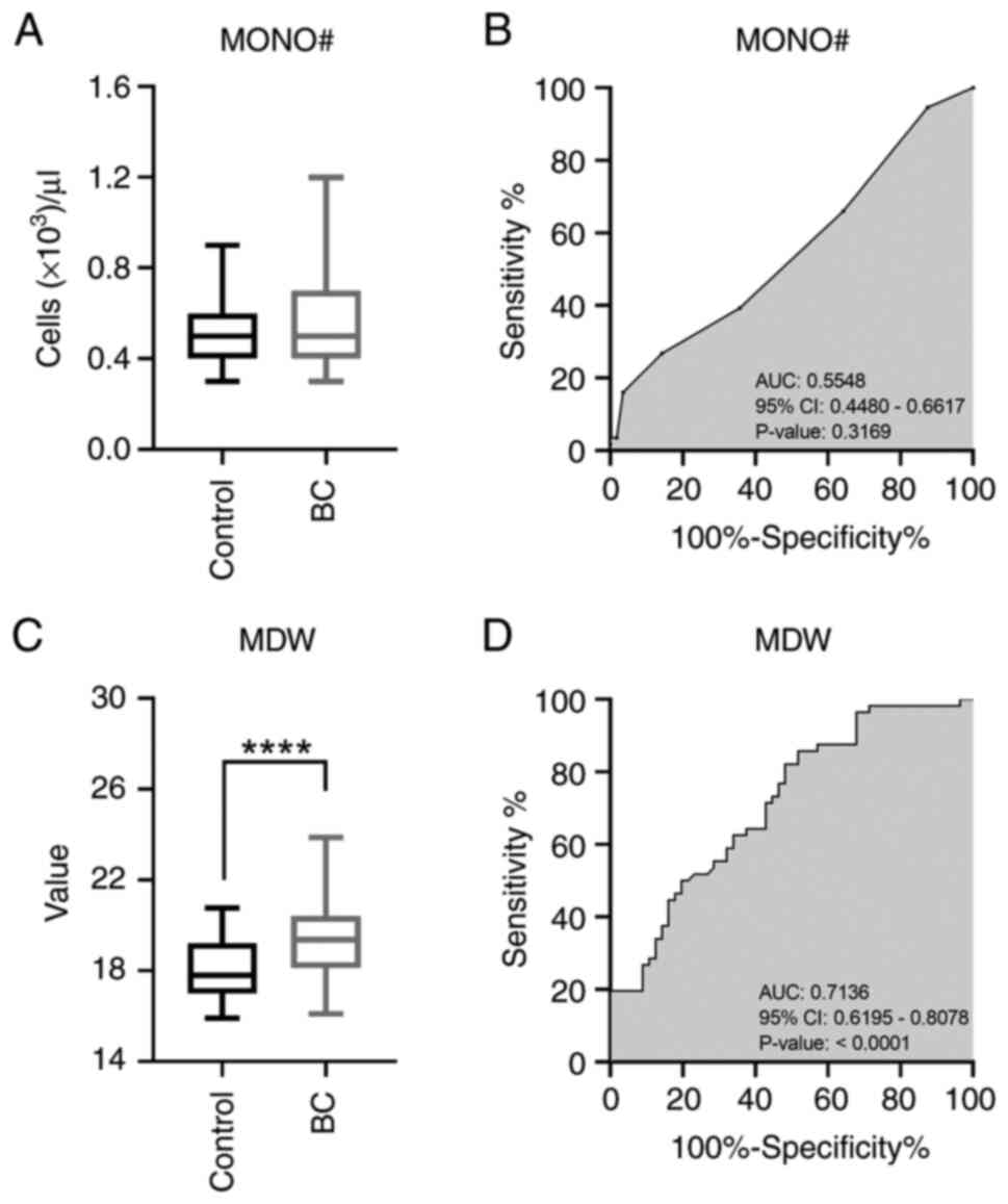These results indicate no significant difference in MONO# between BC and control groups, while, conversely, MDW levels were higher in BC patients than in controls.