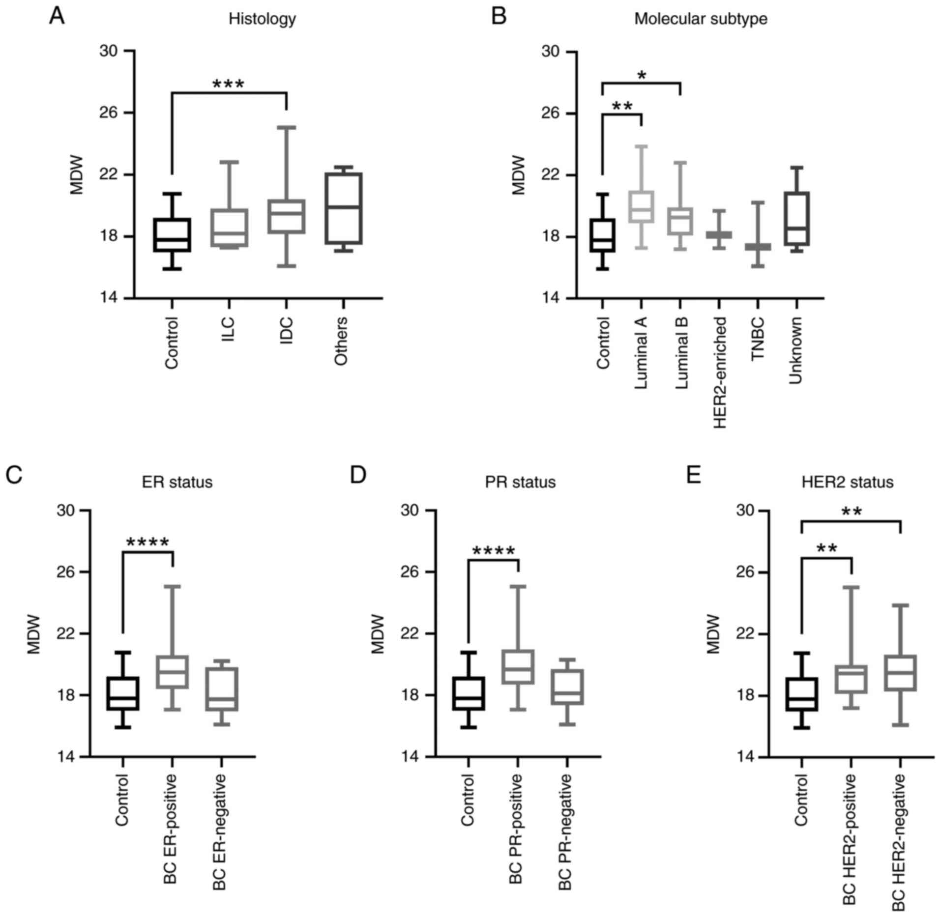 Overall, these findings propose a possible association between MDW and certain histopathological features in BC. Specifically, higher MDW levels were typically found in IDC expressing ERs and PRs. Elevated MDW values were also noted in BC patients presenting either Luminal A or B subtype.