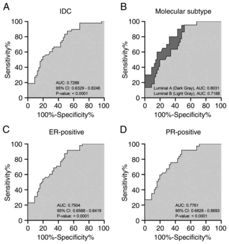Compared to the control group (18.14±1.41), MDW values of 18.77±2.07 (P=0.8815; Q 0.8696), 19.53±1.76 (P=0.0002, Q 0.0011), and 19.84±2.43 (P=0.5824; Q 0.8697) were recorded in ILC, IDC and others histological subtype, correspondingly (Fig. 2A). As the only significant subset, ROC curve revealed an AUC value of 0.7288 (95% CI: 0.6329-0.8246) for IDC (Fig. 3A).