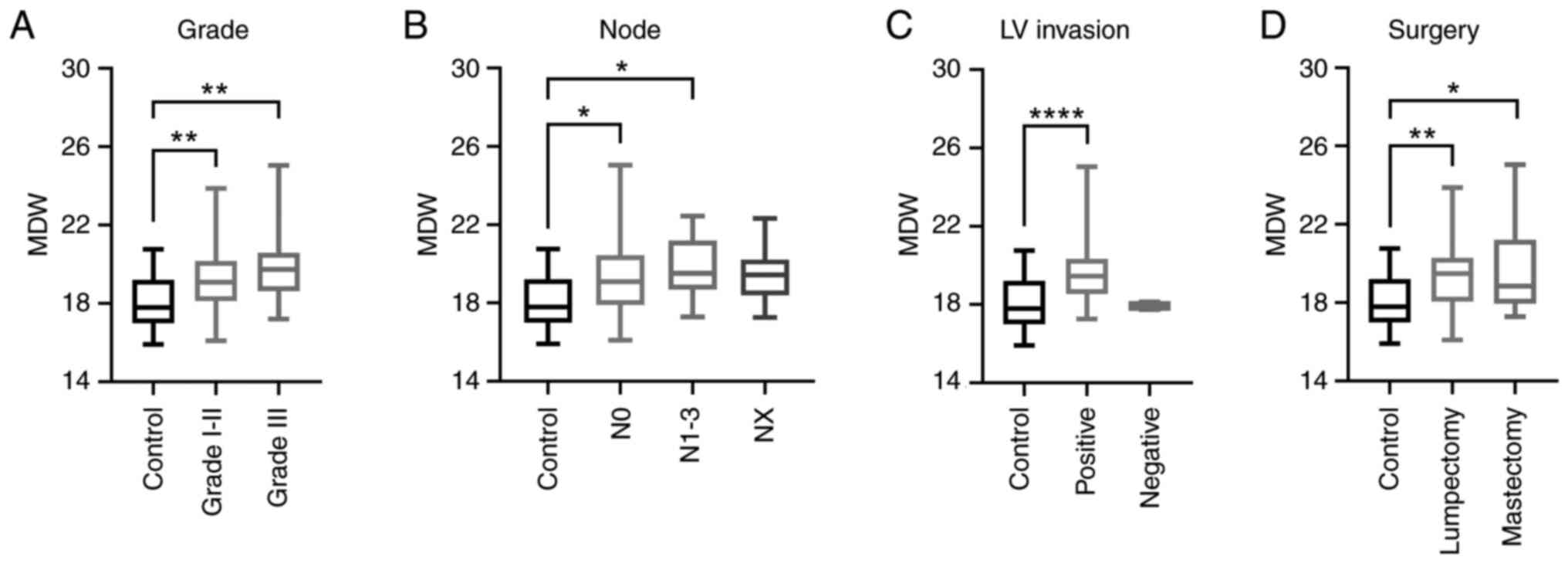 Taken together, these findings suggest that MDW levels could correlate with the progression of both grades and stages in BC. The elevated MDW levels detected in LV-positive BC patients, as well in those undergoing mastectomy (19.55±2.11; P=0.0262; Q 0.0138) rather than lumpectomy (19.37±1.70; P=0.0016; Q 0.0017) (Fig. 4D), support its possible correlation with the BC severity.
