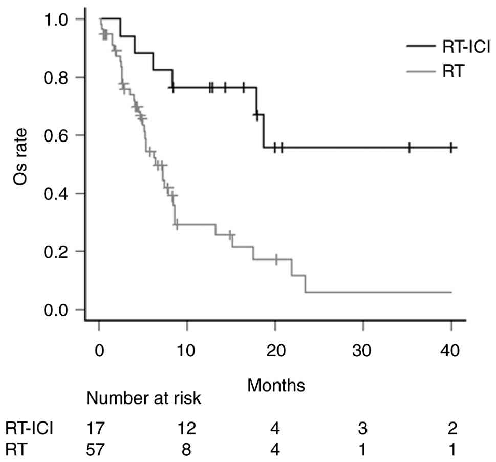 In univariate analysis, RT-ICI treatment [hazard ratio (HR), 0.23; 95% confidence interval (CI), 0.10-0.56; P=0.001], a BED10 ≥39 Gy (HR, 0.44; 95% CI, 0.23-0.85; P=0.015), and better performance status (HR, 2.02; 95% CI, 1.09-3.73; P=0.025) were significantly associated with OS (Table II). In multivariate analysis, performance status (HR, 1.99; 95% CI, 1.02-3.88; P=0.043), RT-ICI treatment (HR, 0.22; 95% CI, 0.09-0.55; P=0.001), and a BED10 ≥39 Gy (HR, 0.46; 95% CI, 0.24-0.91; P=0.025) remained independent prognostic factors.