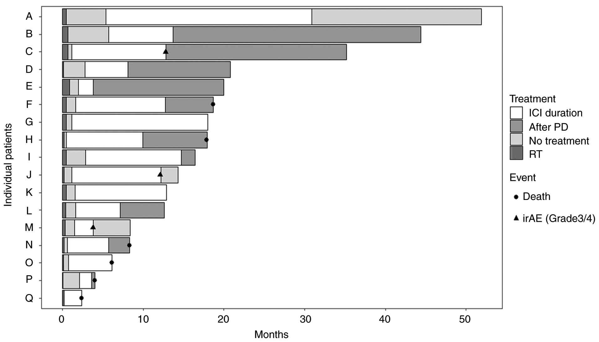 The median follow-up was 6.2 months (range, 0.3-51.8). A significant difference in OS was observed between the RT-ICI and RT groups (P<0.001). The 6-month, 1-year, and 2-year OS rates were 88.2% 76.5, and 55.8% in the RT-ICI group, compared with 54.3, 29.2, and 5.7% in the RT group, respectively (Fig. 1). The PFS rate in the RT-ICI group were 76.5% at 6 months, 52.3% at 1 year, and 20.9% at 2 years. Among the 17 patients in the RT-ICI group, 10 discontinued treatments due to disease progression during the study period (Fig. 2). Post-progression management included systemic therapy in five patients (paclitaxel plus cetuximab in four and pemigatinib in one), local therapy in two patients (BNCT or TPL), and best supportive care in three patients. Three patients discontinued ICI due to grade ≥3 immune-related adverse events (irAEs), specifically grade 4 hepatitis, grade 3 cytokine-release syndrome, and grade 3 adrenal insufficiency. Two patients experienced grade 3 mucositis as adverse events related to palliative radiotherapy.