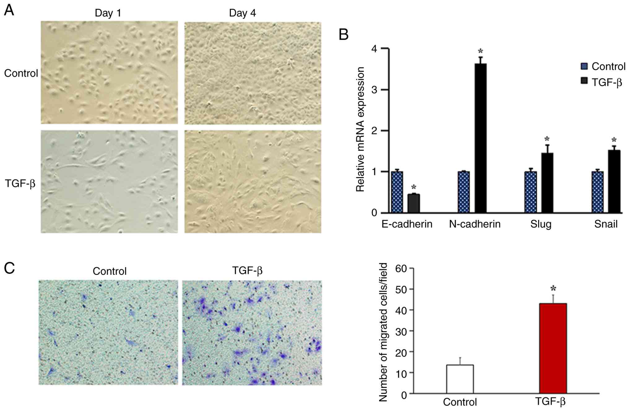 To construct an in vitro EMT model, Huh7 cells were stimulated with 10 ng/ml TGF-β for 4 days, with untreated cells serving as the control group. Compared with this control, the TGF-β-treated Huh7 cells lost their original polarity and transformed into a spindle or typical fibroblast-like phenotype (Fig. 1A). At the molecular level, TGF-β treatment significantly downregulated the mRNA expression of the epithelial marker E-cadherin and upregulated the expression of mesenchymal markers (N-cadherin, Snail and Slug) compared with the control group (Fig. 1B). Functionally, the induction of the EMT led to a significant enhancement in the cell migration ability in the TGF-β treatment group compared with the control (Fig. 1C).