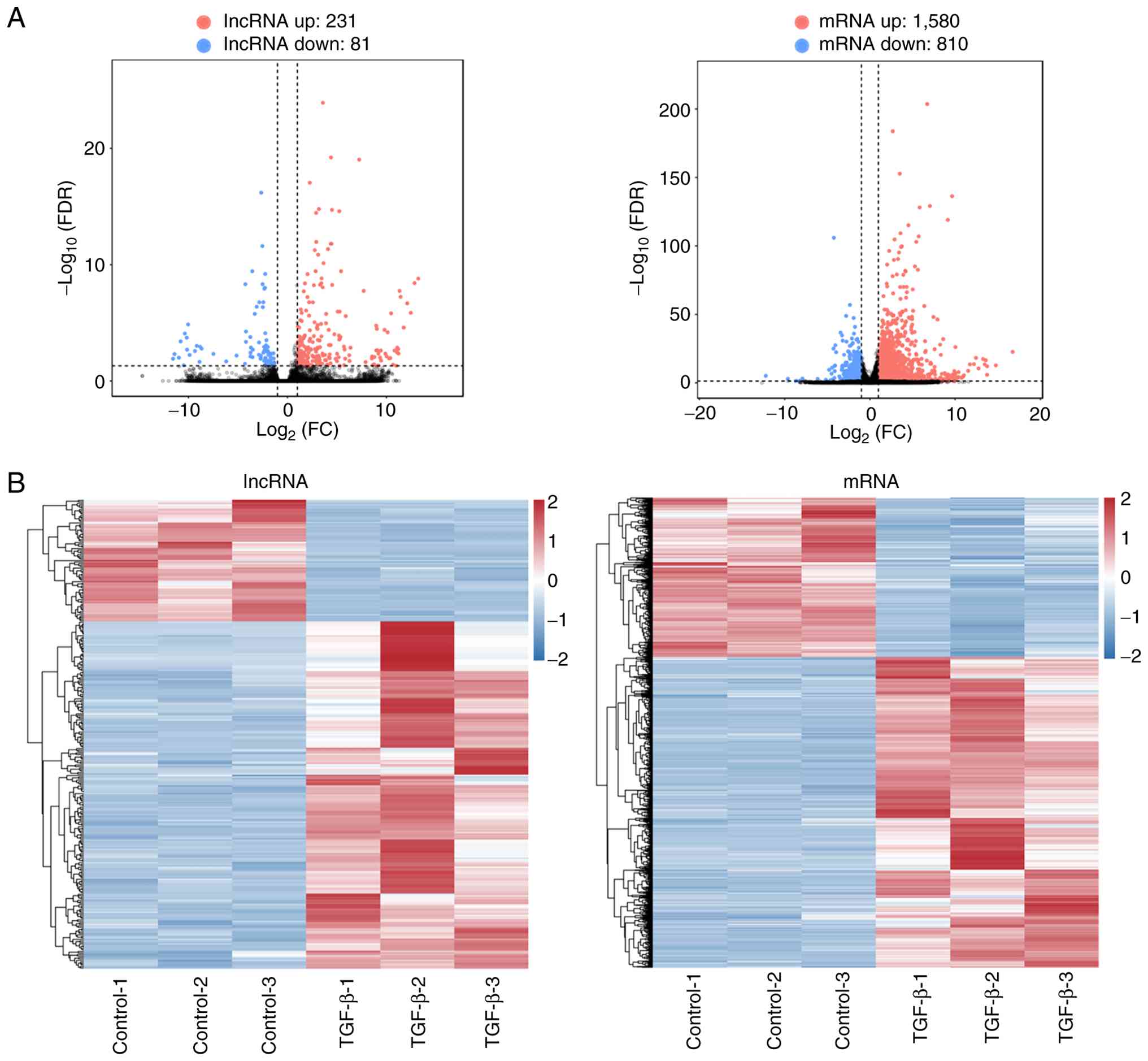 RNA sequencing was carried out to detect the DE mRNAs and lncRNAs in Huh7 cells treated with or without TGF-β. The volcano plots revealed 231 upregulated and 81 downregulated DE lncRNAs (Tables SI and SII) as well as 1,580 upregulated and 810 downregulated DE mRNAs (Tables SIII and SIV) (Fig. 2A). In addition, hierarchical clustering of the DE lncRNAs and mRNAs was carried out and notable differences between the Huh7 cells with or without TGF-β treatment were identified (Fig. 2B). These findings potentially identify key DE lncRNAs (for example, CAV2-214 and TACC1-226) and DE mRNAs (for example, TUBA1A and H4C11) that regulate the EMT process and promote HCC migration.