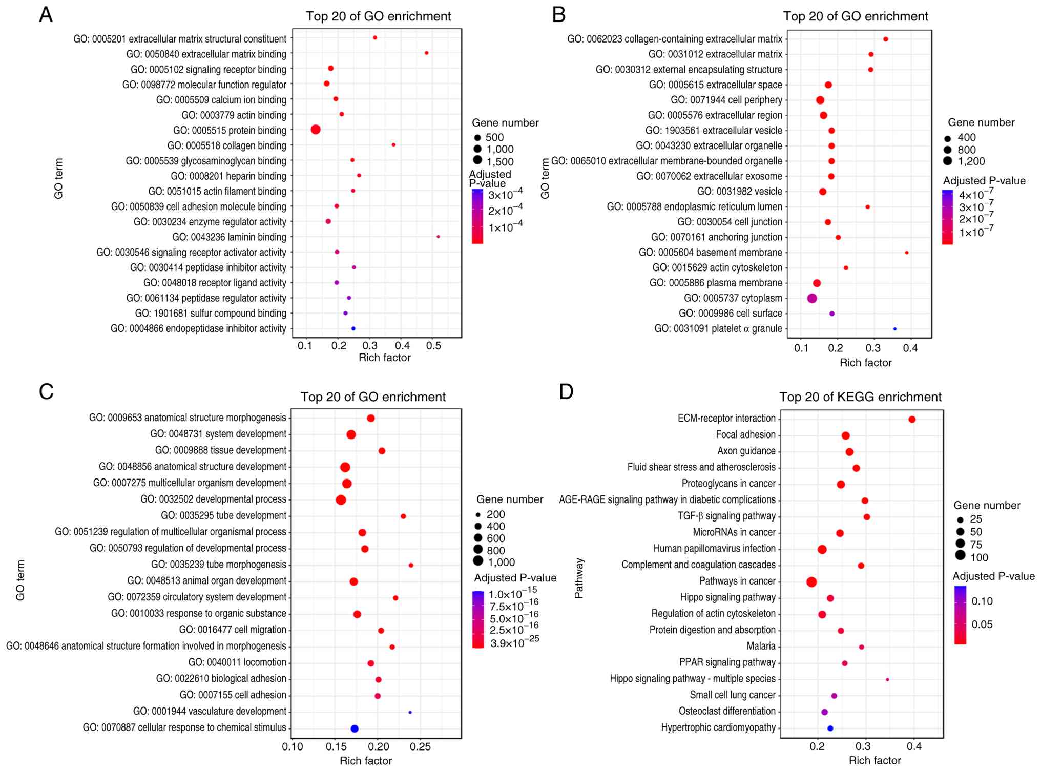 GO and KEGG analyses were carried out using the ‘clusterProfiler’ R package (version 4.0.5; R Development Core Team) to elucidate the potential molecular mechanisms through which DE lncRNAs and mRNAs influence HCC migration by regulating the EMT process. GO analysis was used to classify and annotate the functions of the DE genes, as well as to perform enrichment analysis. KEGG analysis was used to identify significantly enriched signaling pathways or metabolic pathways associated with the DE genes. Q<0.05 was set as the screening criterion.