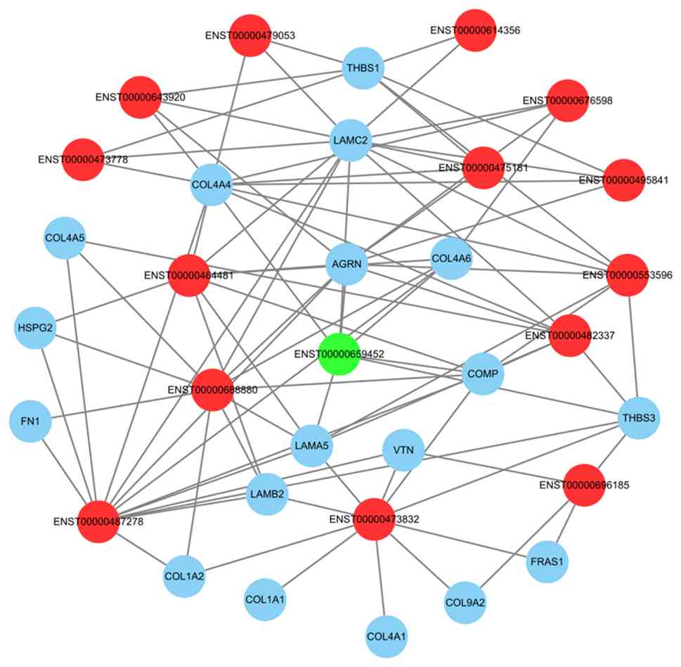 To further investigate how DE lncRNAs potentially affect the migration and development of HCC by regulating the EMT, a network map was constructed based on 15 DE lncRNAs and 18 DE mRNAs. The lncRNA-mRNA interactions were predicted by the previous trans-action analysis (Fig. 4).