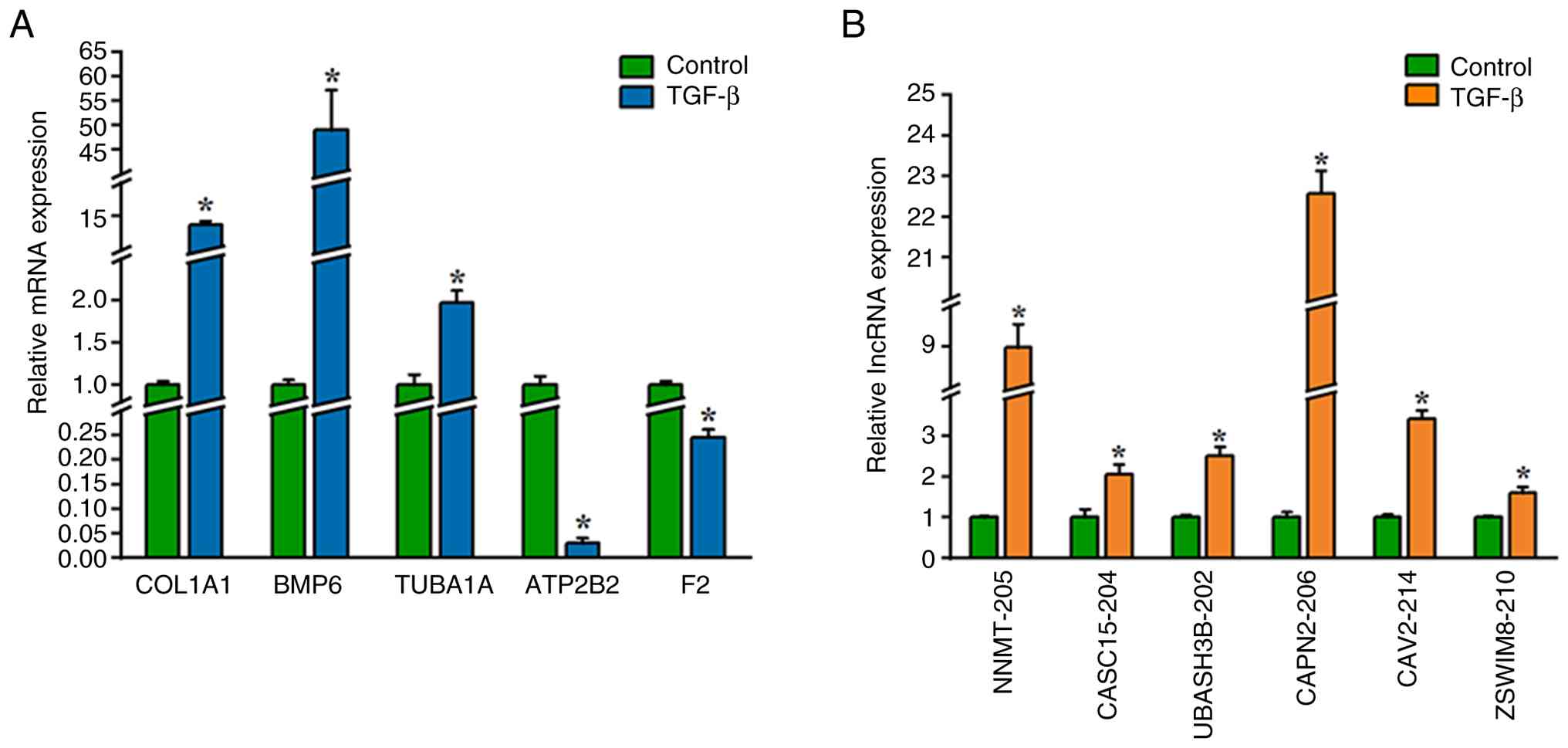 To validate the RNA sequencing results, 5 DE mRNAs (COL1A1, BMP6, TUBA1A, ATP2B2 and F2) and 6 DE lncRNAs (NNMT-205, CASC15-204, UBASH3B-202, CAPN2-206, CAV2-214 and ZSWIM8-210) were selected for RT-qPCR analysis based on their statistical significance and putative association with the EMT. The RT-qPCR results were consistent with the sequencing data. Compared with the control, TGF-β treatment significantly upregulated the expression of COL1A1, BMP6, TUBA1A, NNMT-205, CASC15-204, UBASH3B-202, CAPN2-206, CAV2-214 and ZSWIM8-210. Furthermore, TGF-β treatment significantly downregulated the expression of ATP2B2 and F2 compared with the control (Fig. 5A and B).