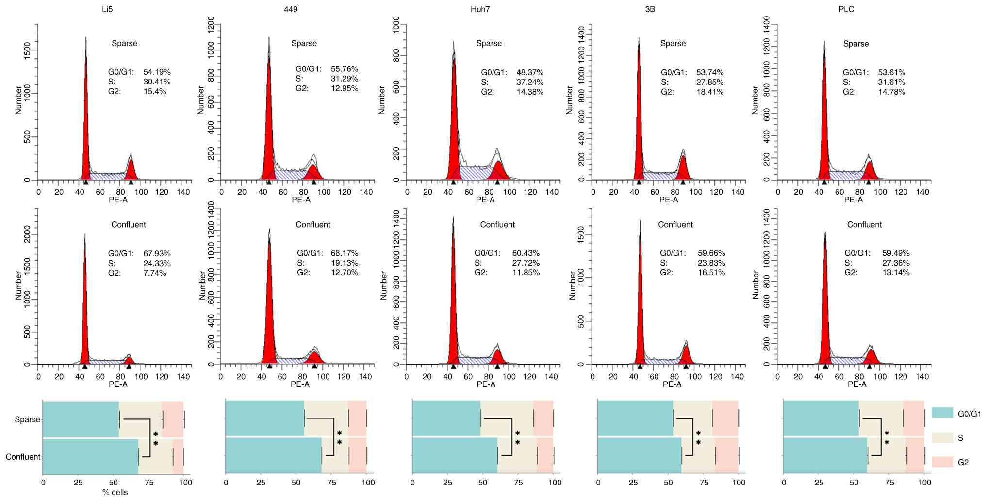 Cancer cells are known to be insensitive to CIP; initially, the responses of four HCC lines, SNU-449, HuH-7, Hep 3B2.1-7 and PLC/PRF/5, and an immortalized human hepatocyte cell line (HepLi5) to high-density cell-cell contact were investigated. As expected, confluent HepLi5 exhibited G0/G1 phase arrest with a proportion of cells in G0/G1 phase increased from 54.19 to 67.93%, compared with sparse cultures (Fig. 1). Nonetheless, all 4 HCC cell lines exhibited varying magnitudes of G0/G1 phase arrest as well; specifically, SNU-449 and HuH-7 suffered more severe inhibition (increased from 55.76 to 68.17%, and 48.37 to 60.43% respectively), contrasting with milder extents observed in Hep 3B2.1-7 and PLC/PRF/5 (increased from 53.74 to 59.66%, and 53.61 to 59.49% respectively) (Fig. 1).