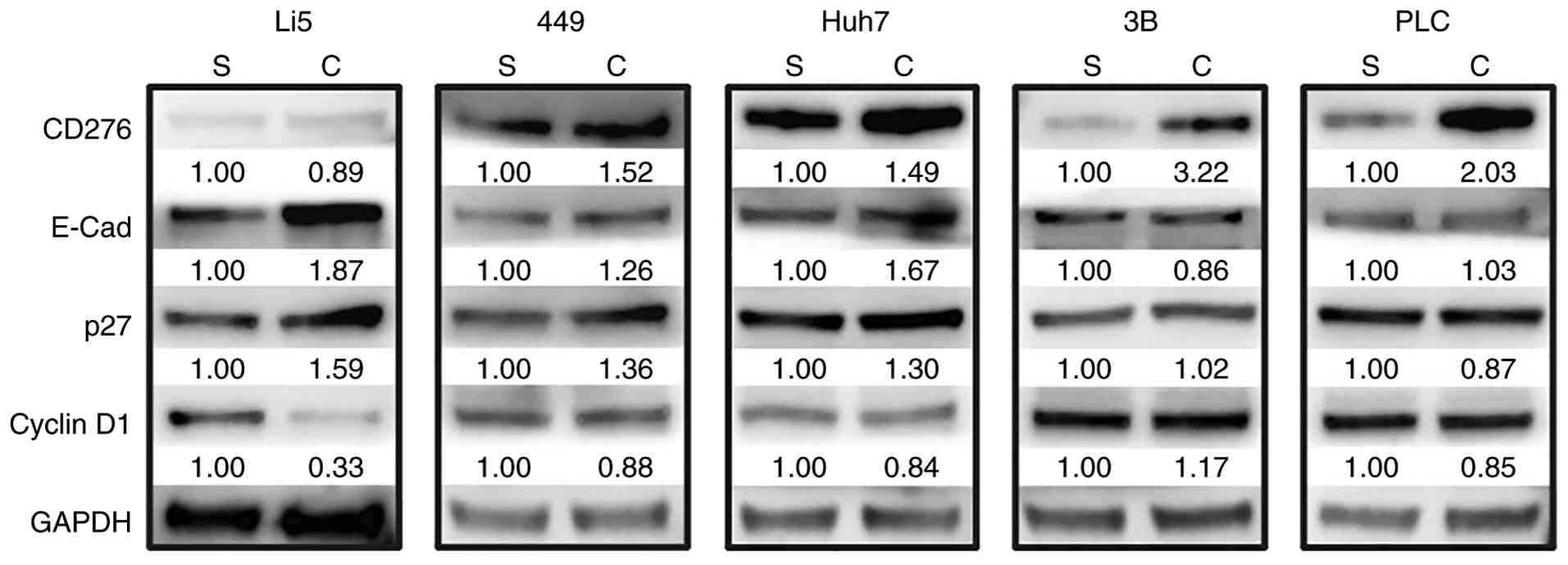 CD276 has been confirmed to promote the proliferation of cancer cells, but whether it plays a role in CIP is currently unclear. Therefore, to investigate this, the alterations of CD276 expression within these cells under confluent culture conditions were examined. The expression of CD276 was increased in the four HCC cell lines, whereas no such elevation was found in HepLi5 (Fig. 2). Moreover, CD276 expression demonstrated a more substantial upregulation in Hep 3B2.1-7 and PLC/PRF/5 relative to SNU-449 and Huh-7 (Fig. 2). Intriguingly, cells exhibiting prominent CIP, namely SNU-449, Huh-7 and HepLi5, concurrently displayed notable elevations in E-Cad expression (Fig. 2). Subsequently, alterations of cell cycle-associated markers, such as p27 and cyclin D1, were also found (Fig. 2). These findings suggest that elevated CD276 expression might help cells overcome CIP, possibly through the modulation of E-Cad expression.