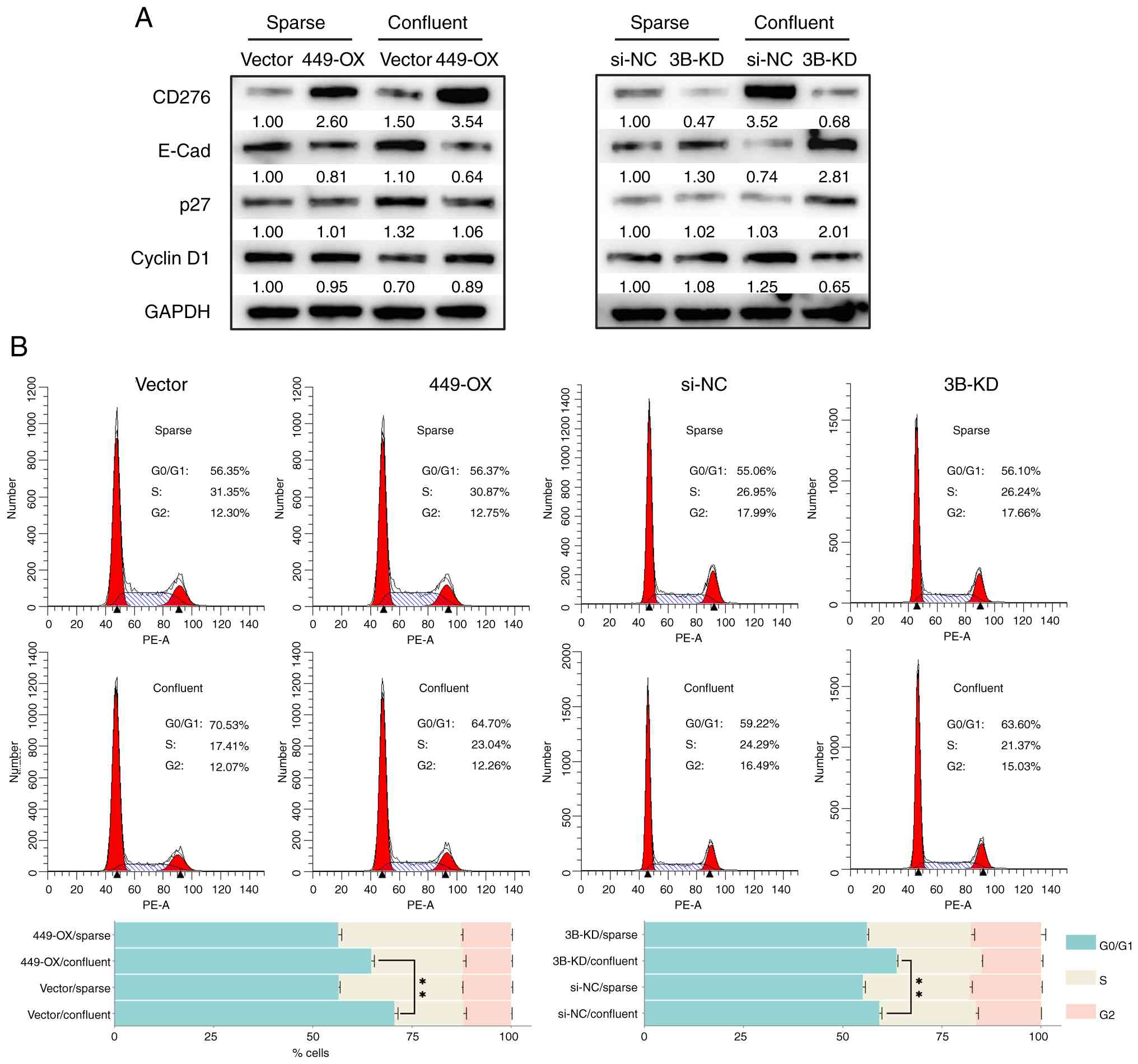To further investigate the impact of CD276 on E-Cad expression, cell lines with either CD276 overexpression or knockdown were established. For SNU-449 cells which were sensitive to CIP, CD276 (abbreviated as 449-OX in following context) was overexpressed. While for Hep 3B2.1-7 cells, which were less sensitive to CIP and showed a marked increase in CD276 expression responding to cell-cell contact, CD276 expression [abbreviated as CD276-knockdown Hep 3B2.1-7 cells (3B-KD) in following context] was suppressed. Under sparse culture conditions, CD276 expression was markedly enhanced in 449-OX cells and suppressed in 3B-KD cells, respectively. Under confluent culture conditions, CD276 expression was further increased in 449-OX cells, while it remained markedly suppressed in 3B-KD cells (Fig. 3A). Under sparse culture conditions, the difference in CD276 expression caused only slight changes in E-Cad expression (Fig. 3A). However, under confluent conditions, as the difference in CD276 expression became more pronounced, the difference in E-Cad expression also became more evident, manifesting as suppressed E-Cad expression when CD276 was highly expressed and enhanced E-Cad expression when CD276 expression was reduced (Fig. 3A). These results indicate that CD276 plays a role in regulating E-Cad expression. Similarly, under confluent culture conditions, more pronounced differences in p27 and cyclin D1 expression were observed in confluent 449-OX and 3B-KD cells (Fig. 3A). Consistent with the changes in p27 and cyclin D1 expression, confluent 449-OX cells exhibited a markedly reduced G0/G1 phase arrest compared with control cells; meanwhile, G0/G1 phase arrest was more pronounced in the 3B-KD cells (Fig. 3B). The cell cycle profiles of 449-OX and 3B-KD cells were further studied, revealing no discernible variations in the proportion of cells in G0/G1 phase compared with control cells when cultured under sparse conditions (Fig. 3B). Consequently, the findings of the present study suggested that CD276's regulation of E-Cad expression is highly dependent on high-density cell-cell contact.