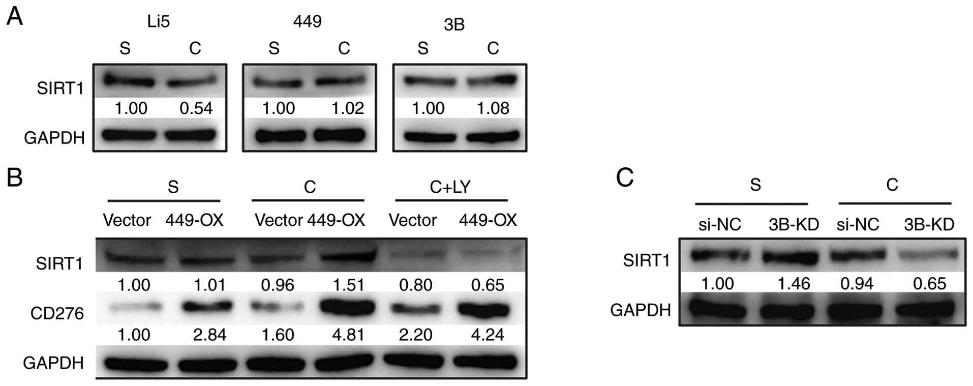 To ascertain whether CD276 could regulate cell proliferation via SIRT1, the expression of SIRT1 under confluent culture conditions was examined and a downregulation of SIRT1 was observed in HepLi5 cells, whereas no such decline was found in two HCC cell lines, SNU-449 and Hep 3B2.1-7 (Fig. 4A). Subsequently, in 449-OX cells, an elevation was found in SIRT1 expression when cultured under confluent conditions (Fig. 4B); by contrast, in 3B-KD cells, SIRT1 expression decreased (Fig. 4C), with its expression change being consistent with that of CD276 (Figs. 4B and 3A). Moreover, when LY294002, an inhibitor of PI3K pathway, was added, the increase in SIRT1 expression in 449-OX cells was abolished, while LY294002 did not significantly affect CD276 expression (Fig. 4B). These findings strongly suggested that CD276 indeed exerts a regulatory effect on SIRT1, with the modulation occurring via the PI3K/AKT pathway.