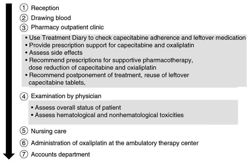 Pharmacists are experts in medications, and in recent years, pharmacists have met with patients to assess the severity of side effects (11-13). The Cancer Institute Hospital, Japanese Foundation for Cancer Research, provides a pharmacy outpatient clinic for patients undergoing outpatient chemotherapy (Fig. 1). In The Cancer Institute Hospital, proactive intervention by pharmacists to check for adherence and side effects (which are one cause of nonadherence) is considered necessary, and a pharmacy outpatient clinic is held for patients receiving oral chemotherapy treatment. The main tasks related to CAPOX performed in the pharmacy outpatient clinic are as follows: i) Use of the capecitabine treatment diary to check for capecitabine adherence and leftover medication; ii) provision of prescription support for CAPOX treatment; iii) assessment of side effects; and iv) suggestion of prescriptions for medication as supportive therapy (13). In practice, prescription support for CAPOX treatment consists of a pharmacist recording the CAPOX doses and the administration period required for the next cycle in the electronic medical record (EMR). This is then checked and authorized by a physician to enable the prescription to be issued. If capecitabine is left over from the previous cycle, the amount to be prescribed is adjusted accordingly. There have been reports of a decrease in the rate of inquiries related to capecitabine as a result of pharmacy outpatient clinics, in addition to decreases in emergency visits and emergency hospitalizations (14,15). However, there are no studies of pharmacists designing prescriptions of anticancer drugs for physicians, which contributed to patient care. Therefore, in the present study, dose intensity and severity of side effects of CAPOX therapy as adjuvant chemotherapy after surgery for gastric cancer before and after outpatient pharmacy clinic follow-up were evaluated.