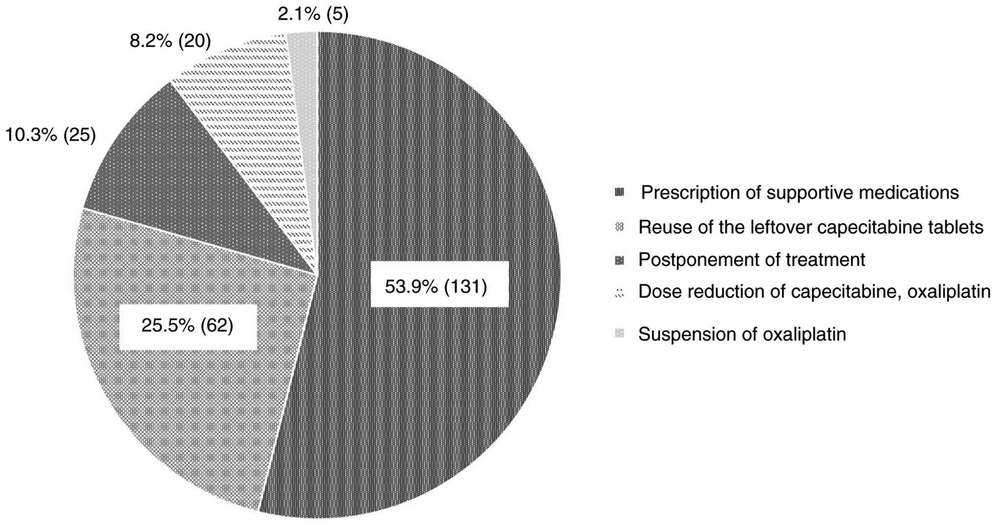 In the pharmacy outpatient clinic of the Cancer Institute Hospital of the Japanese Foundation for Cancer Research, pharmacists checked adherence to oral anticancer drugs and assessed side effects, which are one cause of non-adherence, before the patients were examined by their physicians (12,13). In the pharmacy outpatient clinic, pharmacists conducted direct patient interviews and assessments. In particular, the pharmacists played two important roles, confirmation and suggestion. Confirmation involved checking the patients' adherence to capecitabine and evaluating the side effects. Suggestion involved including suggestions in patients' EMRs regarding the most effective prescription for supportive pharmacotherapy, the timing of the next anticancer drug dose, and the administration regimen. Recommendations for prescriptions at the pharmacy outpatient clinic from the second cycle to the end of treatment were assessed. The number of prescription recommendations of medications for supportive care, reuse of leftover capecitabine, postponement of treatment, dose reduction of each drug, and suspension of oxaliplatin were evaluated. The EMR was utilized as a tool for checking patient history, documenting adherence and side effects, and communicating prescription suggestions to physicians. No artificial intelligence was involved in the patient interview or assessment process during the study period.