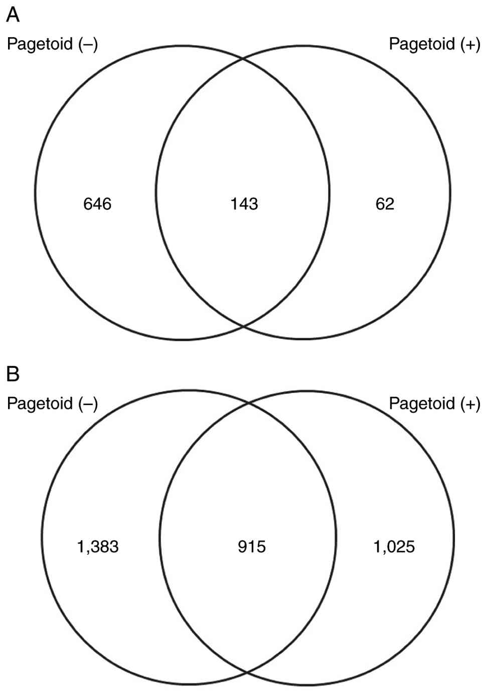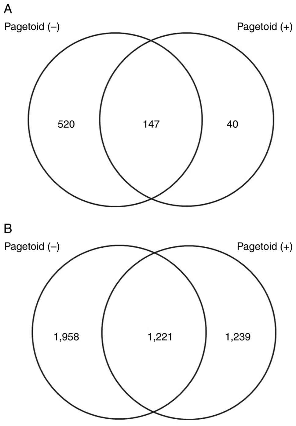 Before molecular analyses, clinicopathological characteristics were reviewed to confirm the comparability of the study groups. All pagetoid spread cases were classified as pathological T1 according to the AJCC staging system (8th edition); one case exhibited a diffuse growth pattern, whereas all remaining cases in both the pagetoid and non-pagetoid groups showed a nodular growth pattern, and no case in either group showed evidence of multicentric origin. A total of 280,241,626 raw reads were obtained for the entire SGC of the eyelid dataset, with each sample yielding at least 20 million reads. This sequencing depth was sufficient to ensure reliable miRNA and mRNA expression analyses. Quality assessment was performed on the raw sequencing data. Low-quality reads and adapter sequences were removed from the datasets. For miRNA analysis, the filtered reads were aligned to the human miRBase using Strand NGS and mapped to known miRNAs. For mRNA analysis, quality-filtered reads were similarly mapped to the human reference genome (GRCh38) using the STAR aligner. The transcript expression levels were quantified as TPM. Expression variation and functional analyses were subsequently performed on both datasets. miRNAs with at least a 1.5-fold change and mRNAs with at least a 2.0-fold change in expression relative to control samples were identified. The Venn diagram in Fig. 1 illustrates the number of genes with increased expression. Fig. 1A presents the number of upregulated mRNAs, whereas Fig. 1B depicts the number of downregulated miRNAs known to suppress the expression of their target genes. Compared with the control group, 789 and 2,205 mRNAs were upregulated in the non-pagetoid and pagetoid groups, respectively, of which 62 were uniquely upregulated in the pagetoid group. By contrast, 2,298 and 1,940 miRNAs were downregulated in the non-pagetoid and pagetoid groups, respectively, of which 1,025 were uniquely downregulated in the pagetoid group. The Venn diagram in Fig. 2 illustrates the number of genes with decreased expression. Fig. 2A and B present the numbers of downregulated and upregulated mRNAs, respectively. Compared with the control group, 667 and 187 mRNAs were downregulated in the non-pagetoid and pagetoid groups, respectively, with 40 uniquely downregulated in the pagetoid group. Conversely, 3,179 and 2,640 miRNAs were upregulated in the non-pagetoid and pagetoid groups, respectively, of which 1,239 were uniquely upregulated in the pagetoid group.