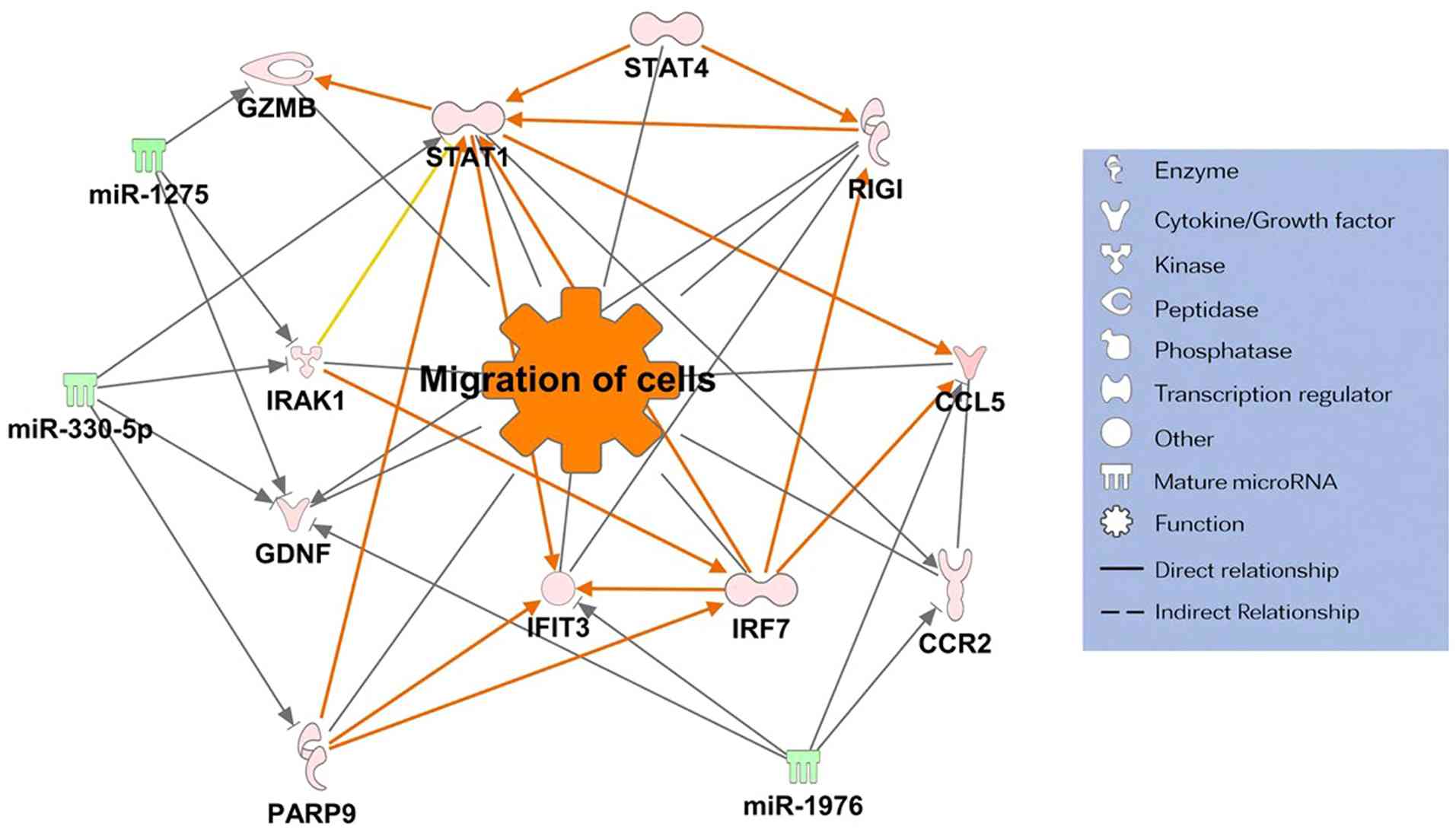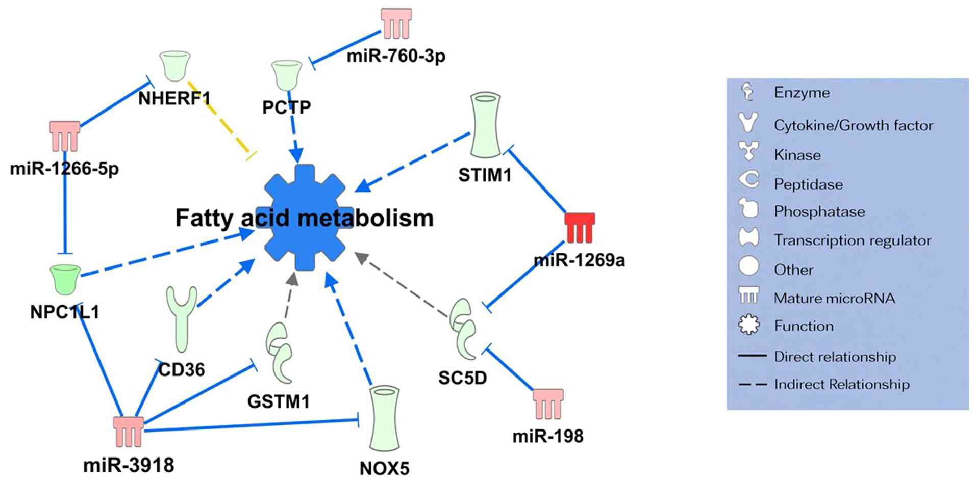To further elucidate regulatory interactions between miRNAs and mRNAs in the pagetoid group, target prediction analysis was performed using the miRNA Target Filter tool in IPA. Consequently, two miRNA-mRNA networks associated with increased gene expression were identified: i) The invasion and migration pathway (Fig. 3) and ii) the immune-inflammatory response pathway (Fig. 4). Notably, both networks shared three common target miRNAs: miR-330-5p, miR-1275, and miR-1976. These miRNAs were consistently involved in gene expression regulation in the pagetoid group and functioned as hub nodes, playing central roles within the networks. Moreover, a miRNA-mRNA network associated with lipid metabolism and gene expression suppression was identified (Fig. 5). This network analysis suggested that five miRNAs, miR-760-3p, miR-1266-5p, miR-3918, miR-1269a, and miR-198, were involved in the regulation of lipid metabolism.