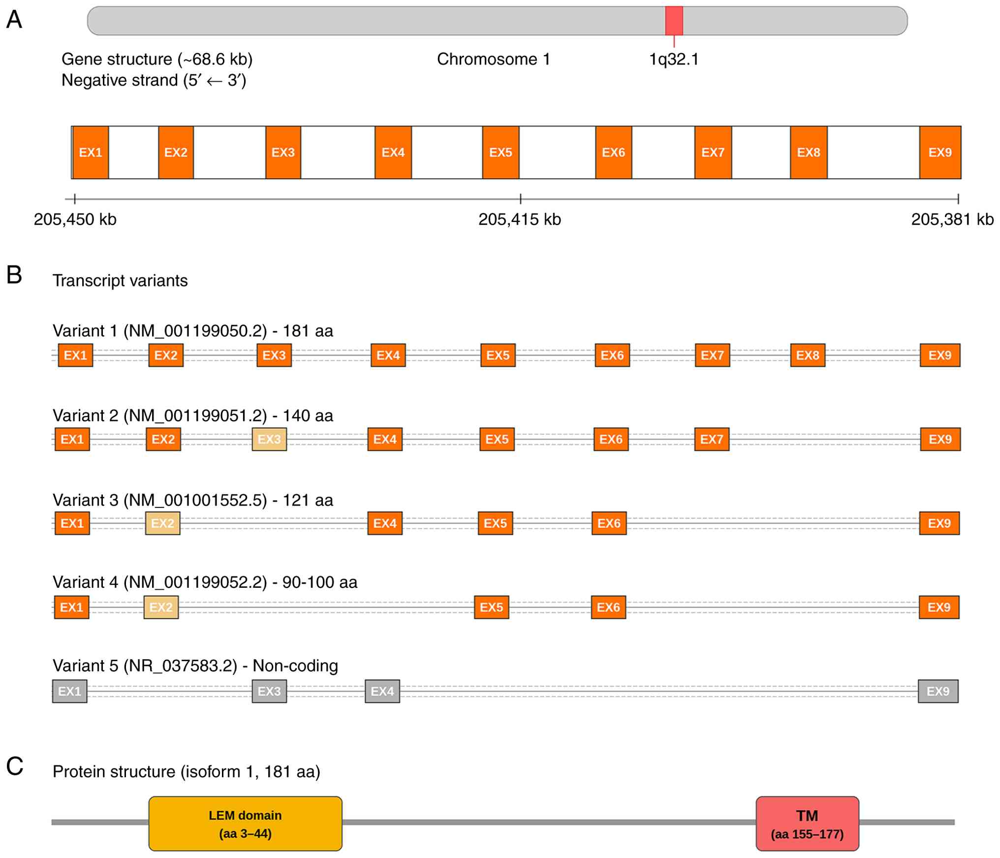 Located in the q32.1 region of human chromosome 1, the LEMD1 gene contains 9 exons, encoding multiple splice variants. At present, five transcript variants have been reported, with V1-3 mainly expressed in testis and colorectal cancer stem cells, while V4 and 5 are expressed at low levels in normal tissues (14). The LEMD1 protein belongs to the LEM domain protein family. The full-length protein consists of 181 amino acids with a molecular weight of ~20 kDa. It contains an N-terminal LEM domain and a C-terminal transmembrane region, making it a single-pass membrane protein (15,16) localized to the inner nuclear membrane, as presented in Fig. 1. The LEM domain is a conserved structure composed of ~40 amino acids that binds to the barrier-to-autointegration factor (BAF) (17). In classic LEM family proteins [such as lamina-associated polypeptide 2β (LAP2β), emerin and MAN1 (also known as LEMD3)], the LEM domain is located on the nucleoplasmic side and can anchor chromatin to the nuclear membrane by binding to BAF or BAF-DNA complexes (14,18). As a member of the aforementioned family, the LEMD1 protein is hypothesized to have similar structural features and interaction interfaces, potentially participating in nuclear membrane-chromatin connections (14,19,20).
