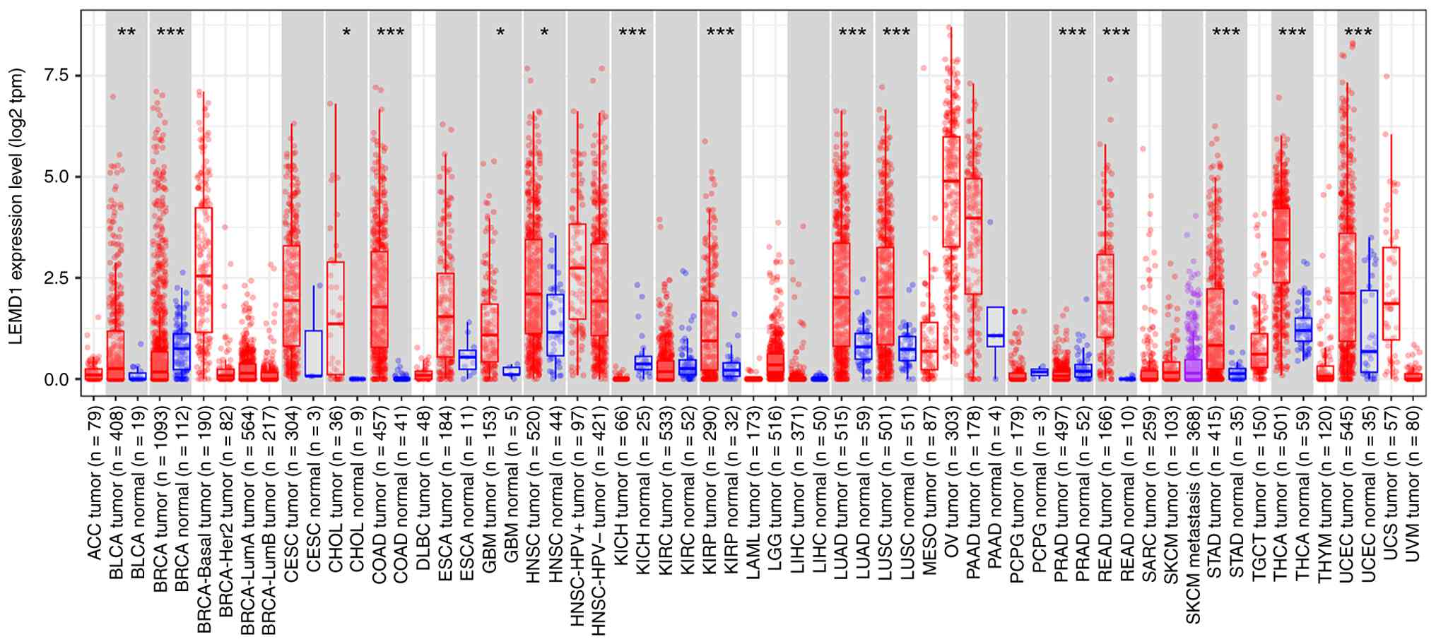 The present analyses using the Tumor Immune Estimation Resource 2.0 database (https://compbio.cn/timer2/) indicated that LEMD1 mRNA was highly expressed across ~20 types of cancer, whereas its expression level was low or undetectable in the majority of normal tissues, as illustrated in Fig. 2. In 2004, a study by Yuki et al (1) first reported a high expression of LEMD1 in colorectal cancer. Subsequently, in a study by Li et al (4), which analyses The Cancer Genome Atlas database and patient samples, reports that LEMD1 is notably upregulated in tissues and cell lines of gastric cancer compared with normal gastric mucosa and normal gastric epithelial cells. In addition to the digestive system, upregulated LEMD1 expression levels are reported in various solid tumors. For example, a study by Ghafouri-Fard et al (23) examines 30 prostate cancer cases and reports LEMD1 transcripts in 23% of them, while none are detected in 25 cases of benign prostatic hyperplasia. In OSCC, ~35% of patient tumors showed positive immunohistochemistry for LEMD1, with elevated LEMD1 protein expression levels in positive tumors (9). Both sequencing analysis and quantitative PCR validation of LEMD1 mRNA reveal notably increased transcription levels in papillary thyroid cancer tissues compared with adjacent normal thyroid tissues (27). Triple-negative breast cancer (TNBC), a type of breast cancer with a poor prognosis, reveals higher LEMD1 expression levels in tissues compared with other subtypes of breast cancer (11). Pancreatic cancer tissues also exhibit abnormally high LEMD1 expression levels, with reports indicating higher mRNA and protein levels compared with normal pancreatic tissues (2). Additionally, elevated LEMD1 expression levels are confirmed in non-small cell lung cancer (NSCLC) and are associated with malignant tumor behaviors. For example, higher LEMD1 levels are associated with poorer differentiation, advanced TNM stage and lymph node metastasis, and it predicts a shorter overall survival in patients with NSCLC (28). Furthermore, LEMD1 is also implicated in anaplastic large cell lymphoma (ALCL), with nucleophosmin-anaplastic lymphoma kinase/STAT3 signaling reported to upregulate LEMD1 expression levels (29). Overall, as a CTA, LEMD1 shows cancer tissue-specific high expression levels in multiple types of tumor, providing a basis for its potential use as a universal tumor marker.