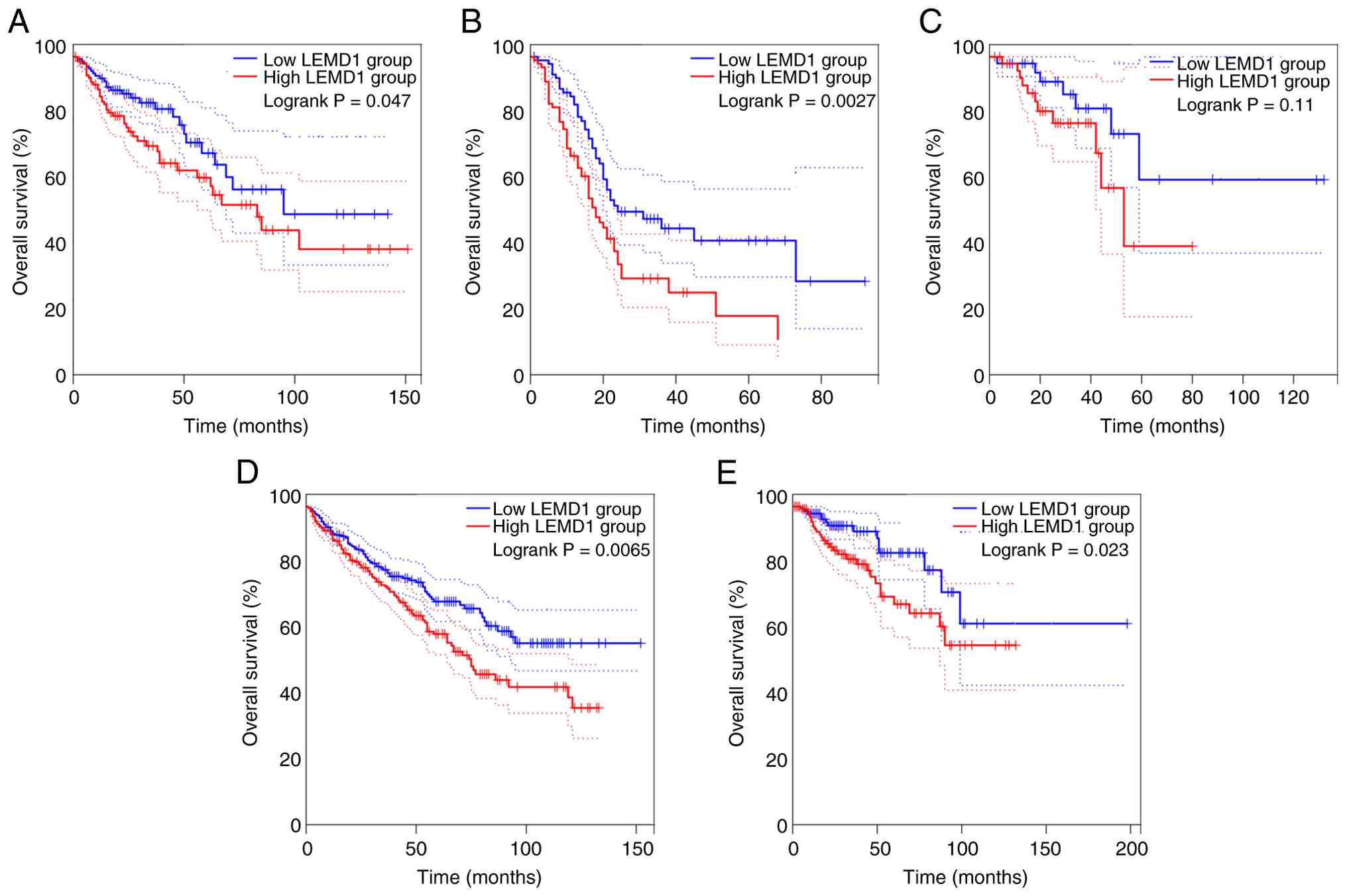 The survival analysis of the present review used the Gene Expression Profiling Interactive Analysis 2 (http://GEPIA2.cancer-pku.cn/) database and revealed that high LEMD1 expression levels were associated with a poor prognosis in colon, rectal, pancreatic and kidney cancer, as presented in Fig. 3. The aforementioned evidence suggests that detecting LEMD1 expression levels in tumor samples has the potential to provide useful prognostic information for clinical practice and guide subsequent treatment strategies.