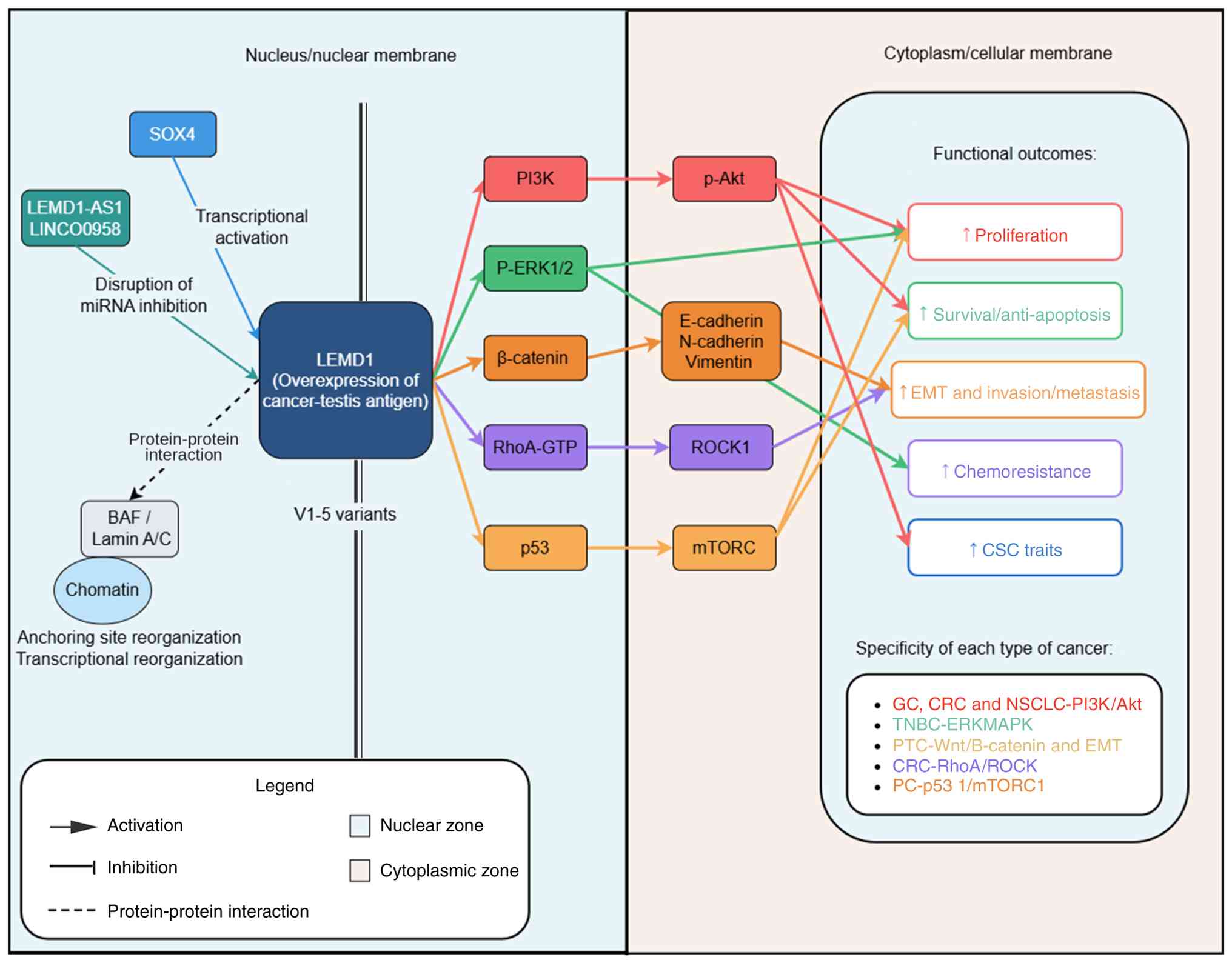The present review summarized the molecular structure and biological functions of LEMD1, its expression patterns and clinical relevance across diverse tumors, mechanistic insights into its tumor-promoting actions, and emerging therapeutic approaches. Unlike previous reports that investigate LEMD1 in a single type of tumor or along a single pathway, the present review provided two distinct advances. Firstly, it provided, to the best of our knowledge, the first comprehensive integration of the nuclear-inner-membrane localization of LEMD1 with five convergent cytoplasmic signaling cascades, namely PI3K/Akt, ERK/MAPK, Wnt/β-catenin, Ras homolog family member A (RhoA)/Rho-associated coiled-coil-containing protein kinase (ROCK) and p53/mTORC1, each of which were previously only examined in isolation (2,9-11). Secondly, the present review offered a systematic synthesis of ‘expression-signaling-clinical relevance’ data for LEMD1 across >10 tumor entities, allowing for the construction of a cross-cancer landscape, which has not been addressed in previous LEMD1-related studies (12,13) and highlighted its diagnostic and therapeutic potential.