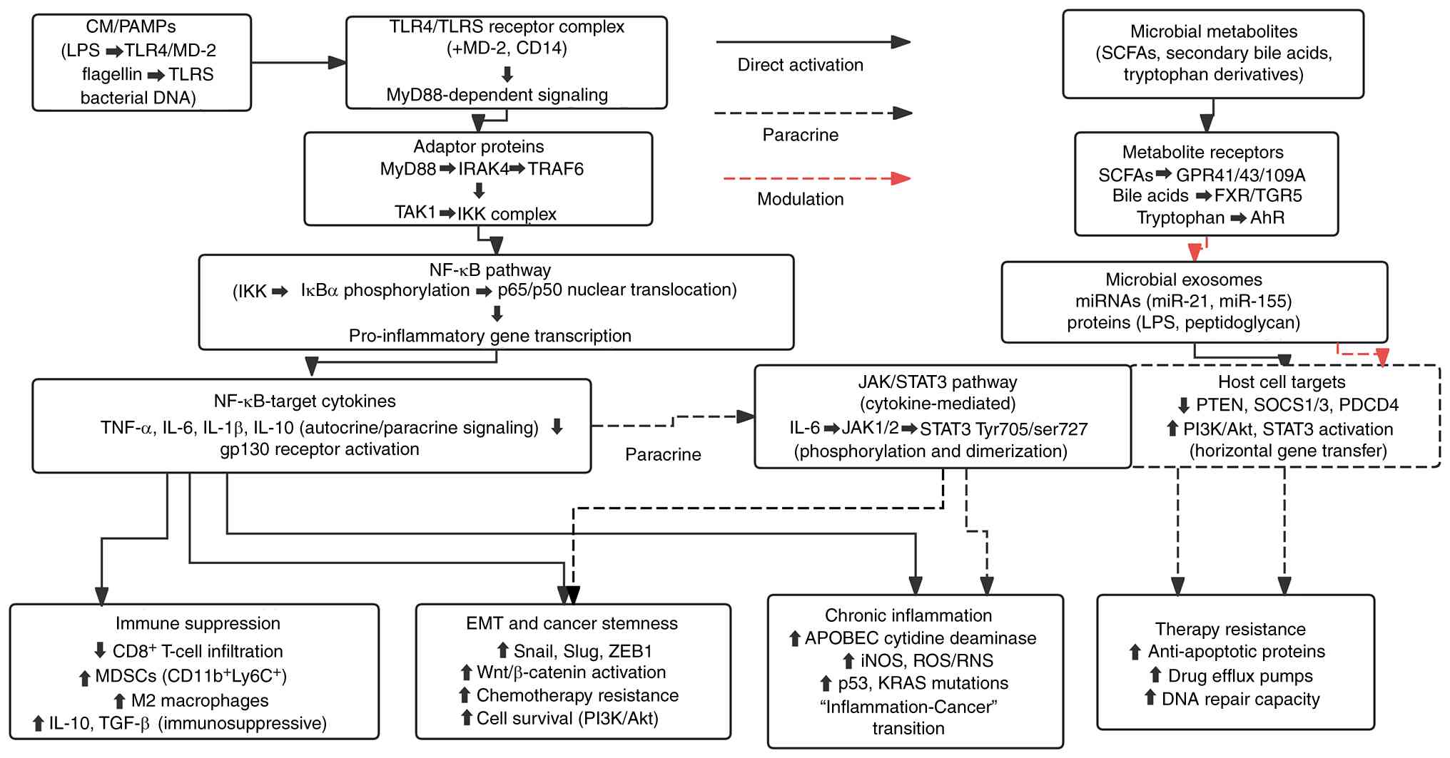 Moreover, PAMPs can trigger signal transducer and activator of transcription 3 (STAT3) serine phosphorylation via the TLR4/TLR5-JAK2 axis, driving epithelial-mesenchymal transition, maintenance of cellular stemness, and the formation of drug-resistant phenotypes. Balic et al (29) confirmed that this non-canonical STAT3 activation is a core node in TLR4-mediated glycolytic reprogramming and macrophage polarization. Extensive crosstalk exists between the Wnt and STAT3 pathways; microbe-mediated STAT3 activation indirectly enhances Wnt signaling, further boosting chemotherapy tolerance (30). Concurrently, microbial metabolites or LPS-induced inflammatory factors like TNF-α inhibit apoptosis by activating the PI3K/Akt pathway, thereby enhancing tumor cell survival and resistance to chemotherapeutic agents (31).