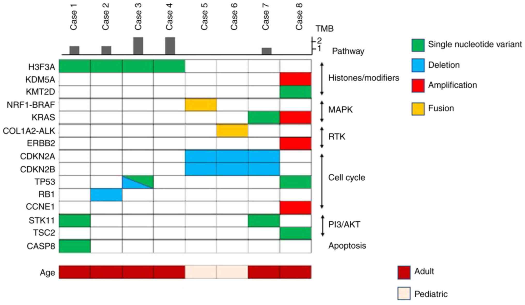 In 75% of the cases without H3F3A mutation (case nos. 5, 7 and 8; Table II), mitogen-activated protein kinase (MAPK) signaling pathway gene alterations were found (KRAS single nucleotide variant, KRAS amplification, nuclear respiratory factor 1 (NRF1)-BRAF fusion). Moreover, the collagen type I alpha 2 chain (COL1A2)-ALK fusion was detected in the remaining one case (case no. 6). All 4 cases without H3F3A mutation (case nos. 5-8) had gene alterations related to cell cycle regulators [cyclin-dependent kinase inhibitor 2 (CDKN2)A and CDKN2B loss, TP53 mutation and cyclin E1 (CCNE1) amplification]. OF note, 1 case had alterations in epigenetic modulator genes, such as KDM5A or KMT2D (Fig. 1 and Table II).