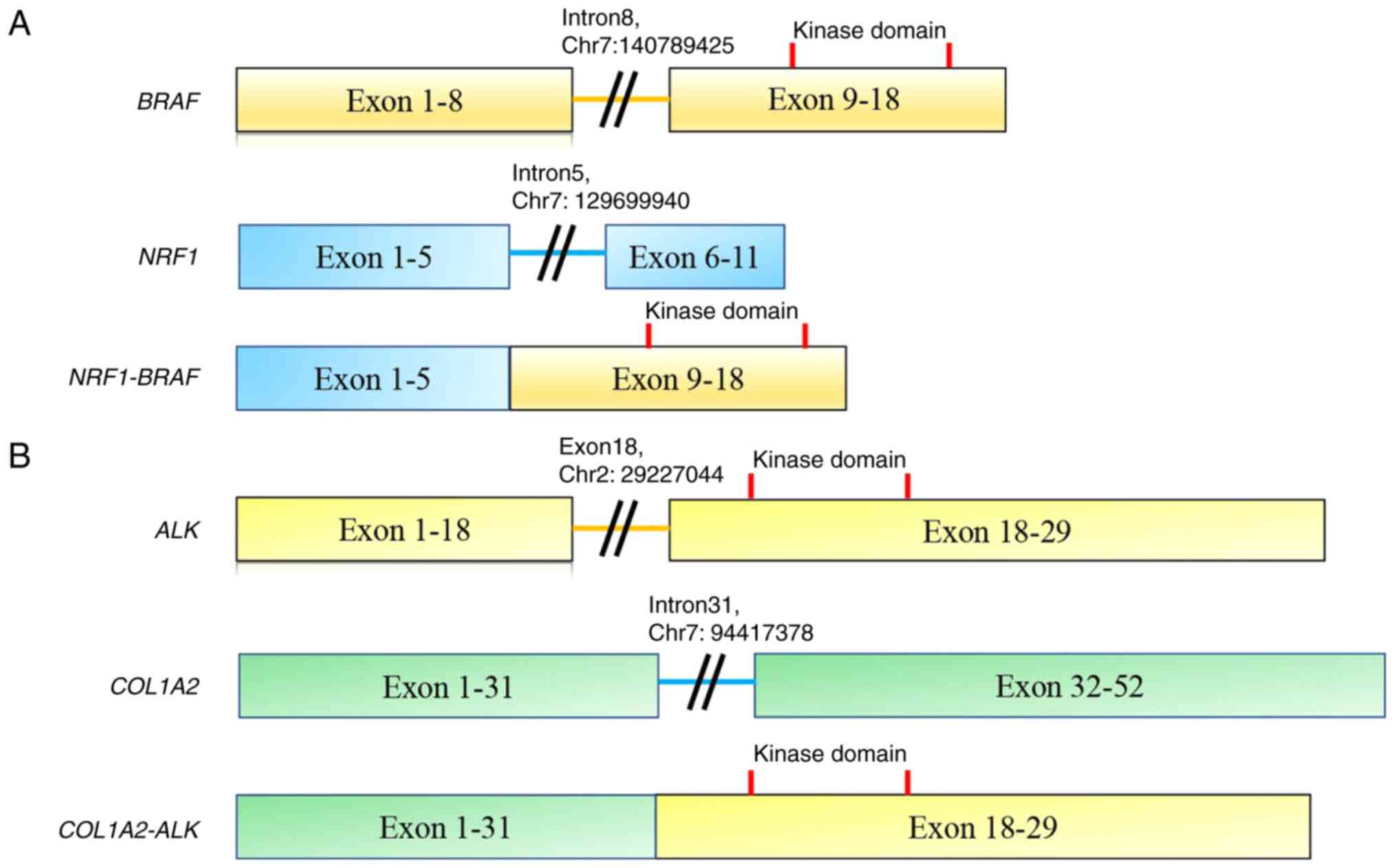 Two fusion genes (NRF1-BRAF and COL1A2-ALK) need to be carefully validated following the pathology rereview. BRAF or ALK fusion has not yet been reported in malignant GCTB. The NRF1-BRAF fusion gene was previously detected in 2 cases of anaplastic pleomorphic xanthoastrocytoma (PXA) and urothelial carcinoma (19,20). In the case of PXA, the predicted fusion protein contained exons 1-5 of NRF1 and the serine/threonine kinase domain of BRAF. Immunohistochemistry confirmed the robust activation of the MAPK signaling pathway. The loss of CDKN2A was also found in the tumor (19). Another case involved a high-grade papillary urothelial carcinoma in the renal pelvis that had invaded the renal parenchyma and spread to the lymph nodes, liver, cervical and lumbar spine and humerus. F1CDx examined a biopsy of the liver lesion and discovered the NRF1-BRAF fusion. On the basis of the genomic results, the patient opted to begin a trial of trametinib (Mekinist), a second-generation MEK inhibitor. Following 2.5 months of treatment, an MRI scan revealed that the tumor had shrunk by 48.4% (20). In the present study, in case 5, NRF1 intron 5 (chr7: 129699940) and BRAF intron 8 (chr7: 140789425) were involved, retaining the serine/threonine kinase domain of BRAF. Although the confirmation of the fusion transcript and immunohistochemistry for MAPK signaling pathway activation is desirable, the case in the present study may be a candidate for targeted therapy, including MEK and/or BRAF inhibitors.